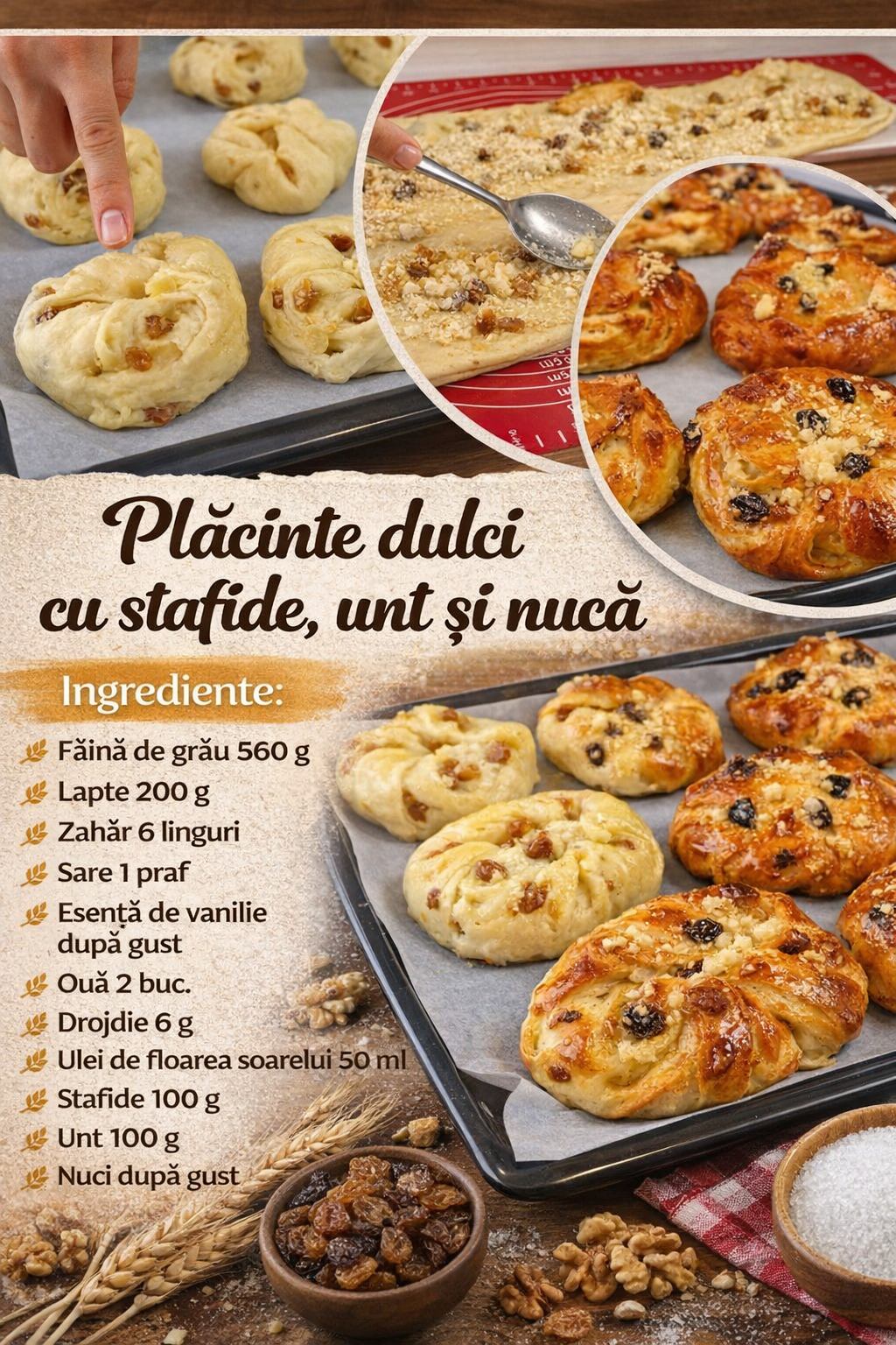 Se amesteca stafidele cu zaharul ramas si 120 g faina de grau.