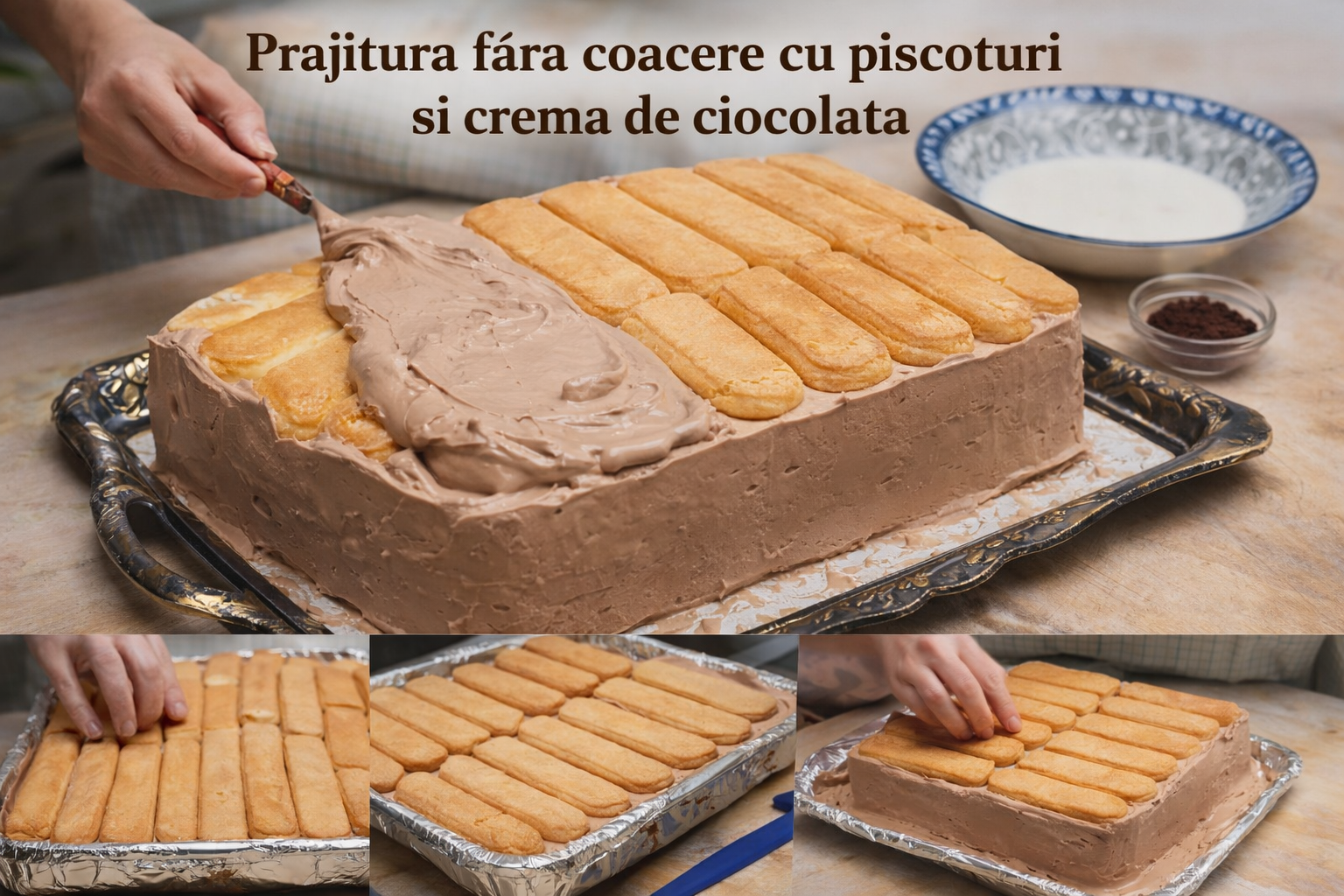 Pregatirea este foarte simpla, trebuie doar sa puneti piscoturile in tava si sa turnati crema deasupra.