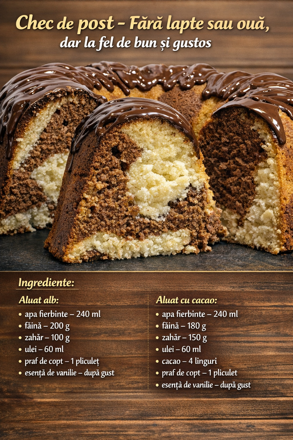 Ne uitam la o reteta exceptionala de post pe care o preparati fara lapte si oua. Nu contine produse de origine animala, dar va este garantat sa va bucurati de gustul de vanilie si ciocolata. Reteta este excelenta nu numai pentru persoanele care postesc, ci si pentru oricine doreste sa reduca produsele de origine animala si sa incerce deserturi vegane. In plus, pregatirea este foarte simpla.