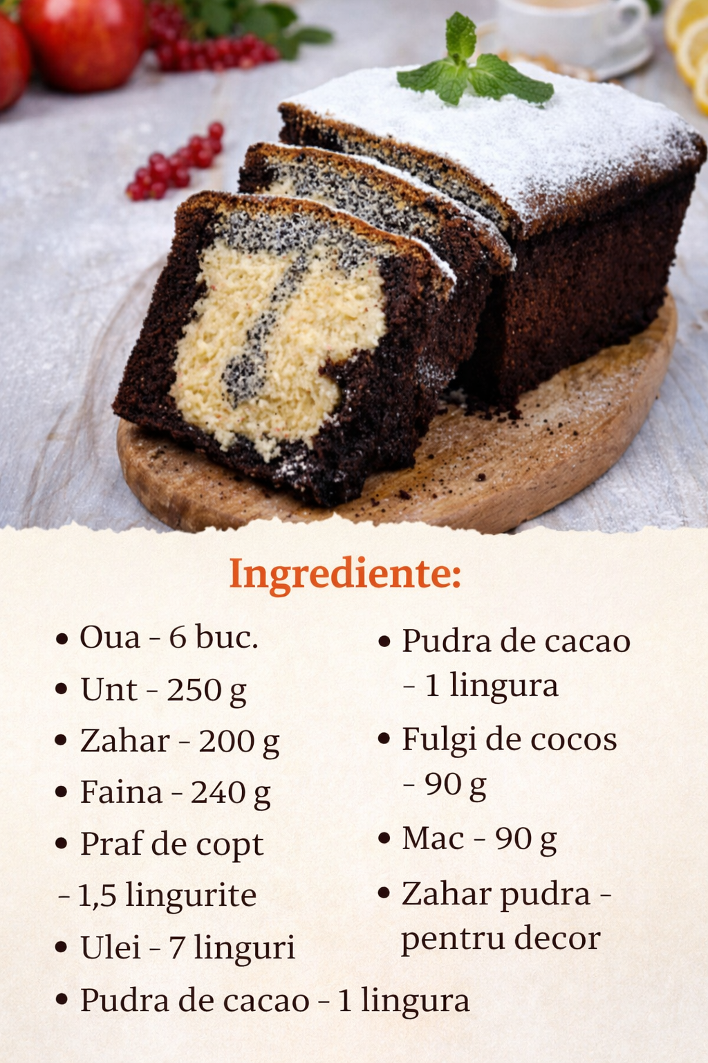 Impartiti aluatul in 3 portii egale. Se amesteca una cu cacao, cealalta cu nuca de cocos. Si in a treia parte, adaugati macul.