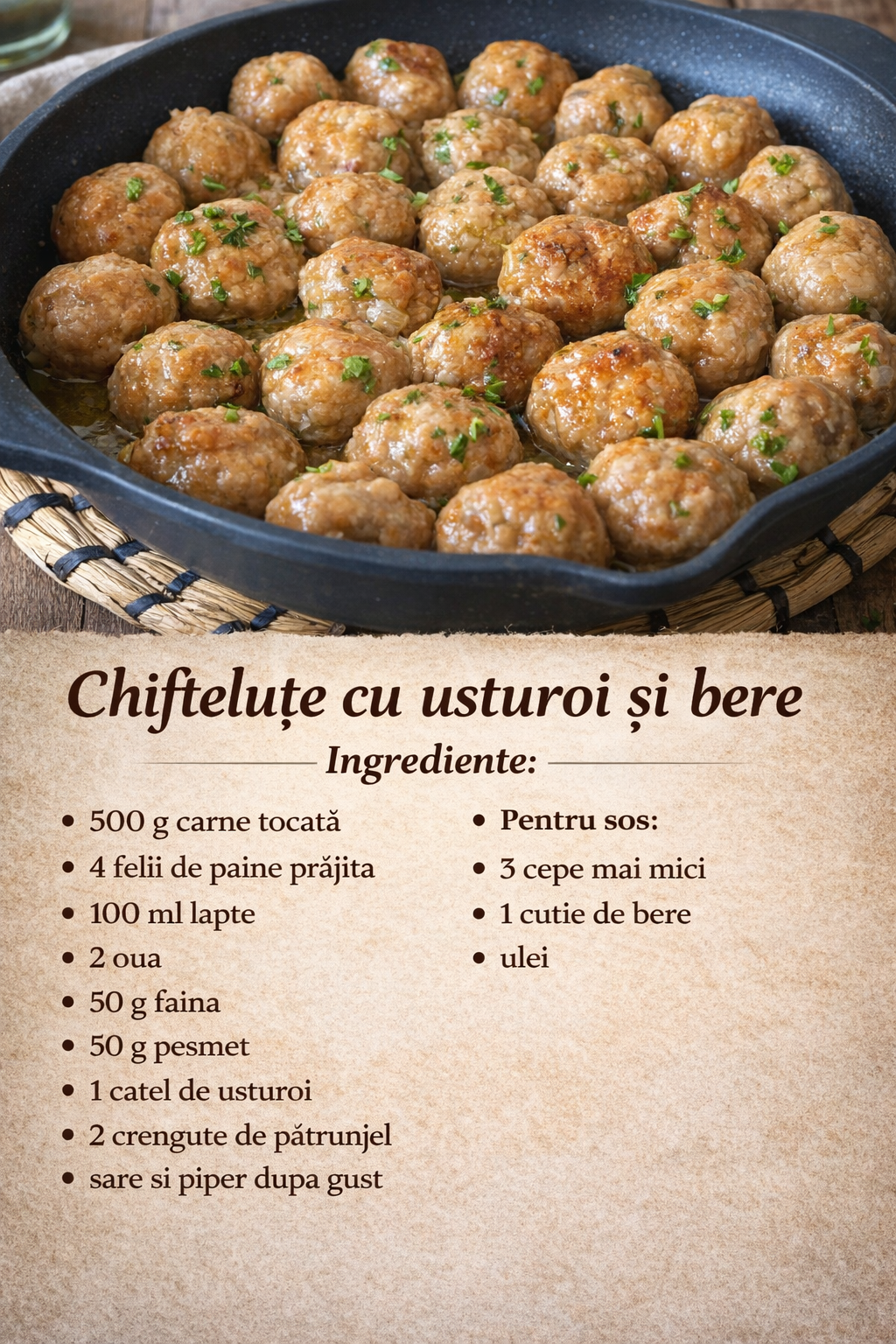 Ceapa se toaca marunt si se prajeste in ulei . Apoi se toarna o cutie de bere peste ceapa. Puneti chiftelele in acest sos si lasati-l sa fiarba timp de aproximativ 10-15 minute.