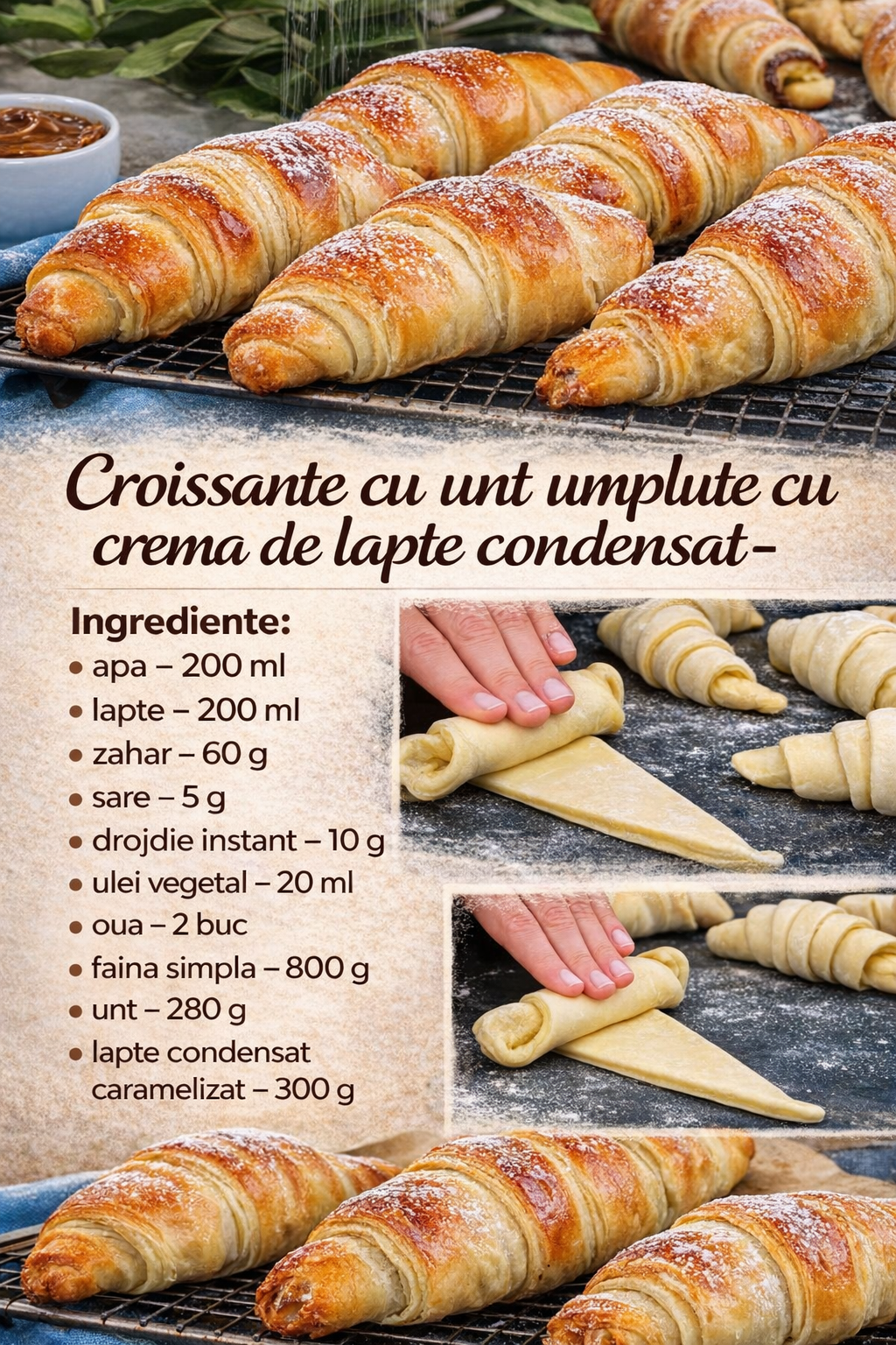 Asezati o lingurita de lapte condensat caramelizat in centrul bazei spre marginea crestaturii si infasurati-o in aluat de la baza pana la varf, creand forma unui croissant.