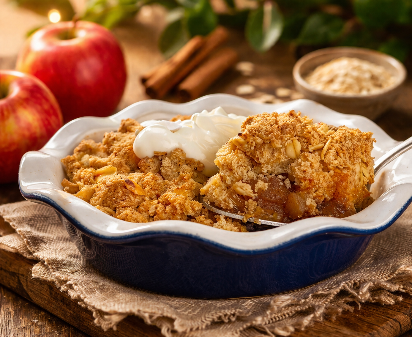 <p class="isSelectedEnd">6ï¸â£ Presara crumble-ul peste mere.</p>