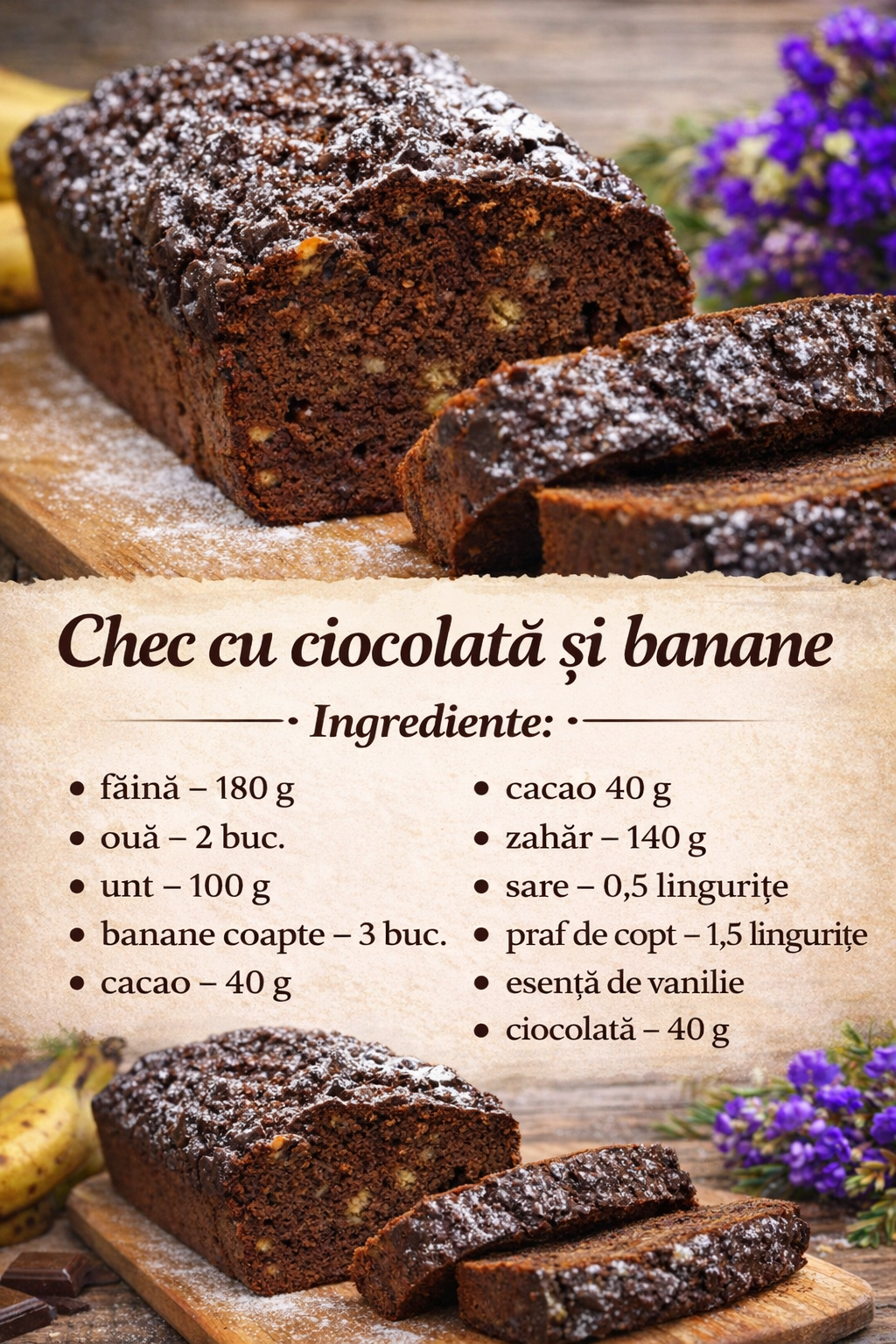 Turnal aluatul in tava de chec si dam tava la cuptorul preincalzit la 180 de grade C timp de aproximativ 40 de minute.