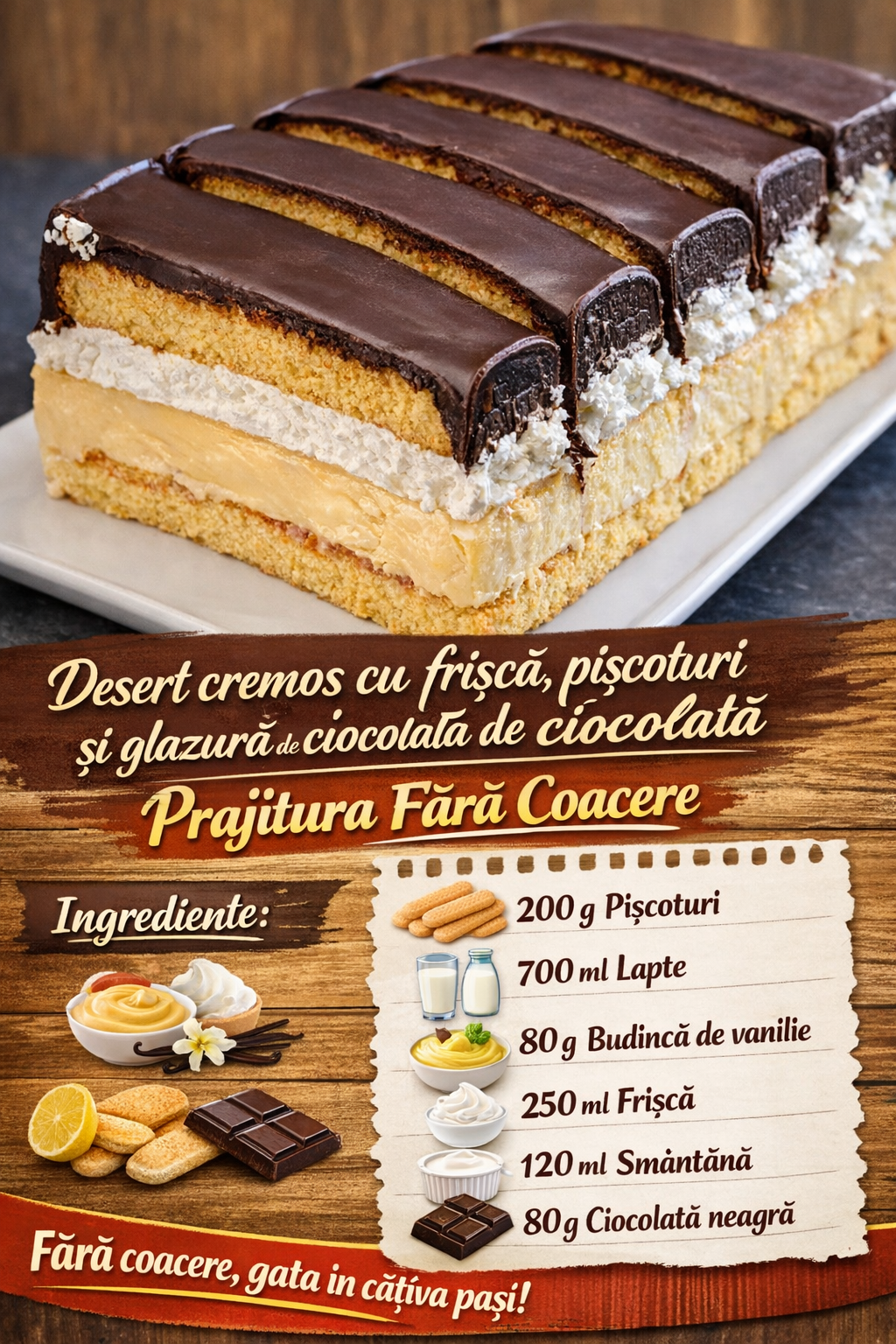 Apoi puneti piscoturile ramase inmuiate in lapte peste frisca batuta si turnati peste glazura de ciocolata, pe care ati pregatit-o din smantana de gatit fierbinte si ciocolata neagra sparta.