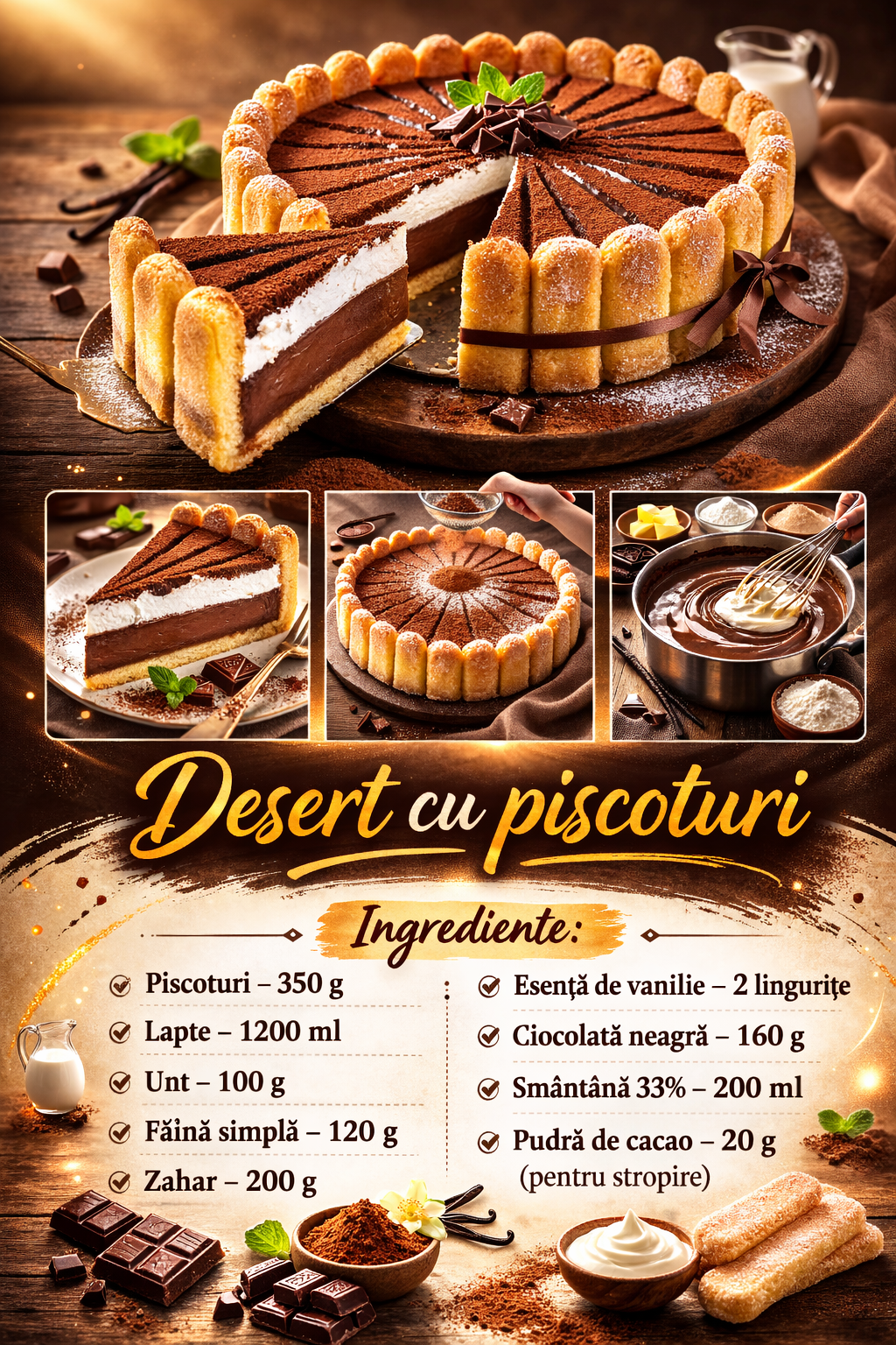 Inmuiati fiecare piscot in lapte si aranjati-le in jurul perimetrului formei si apoi pe toata suprafata fundului.