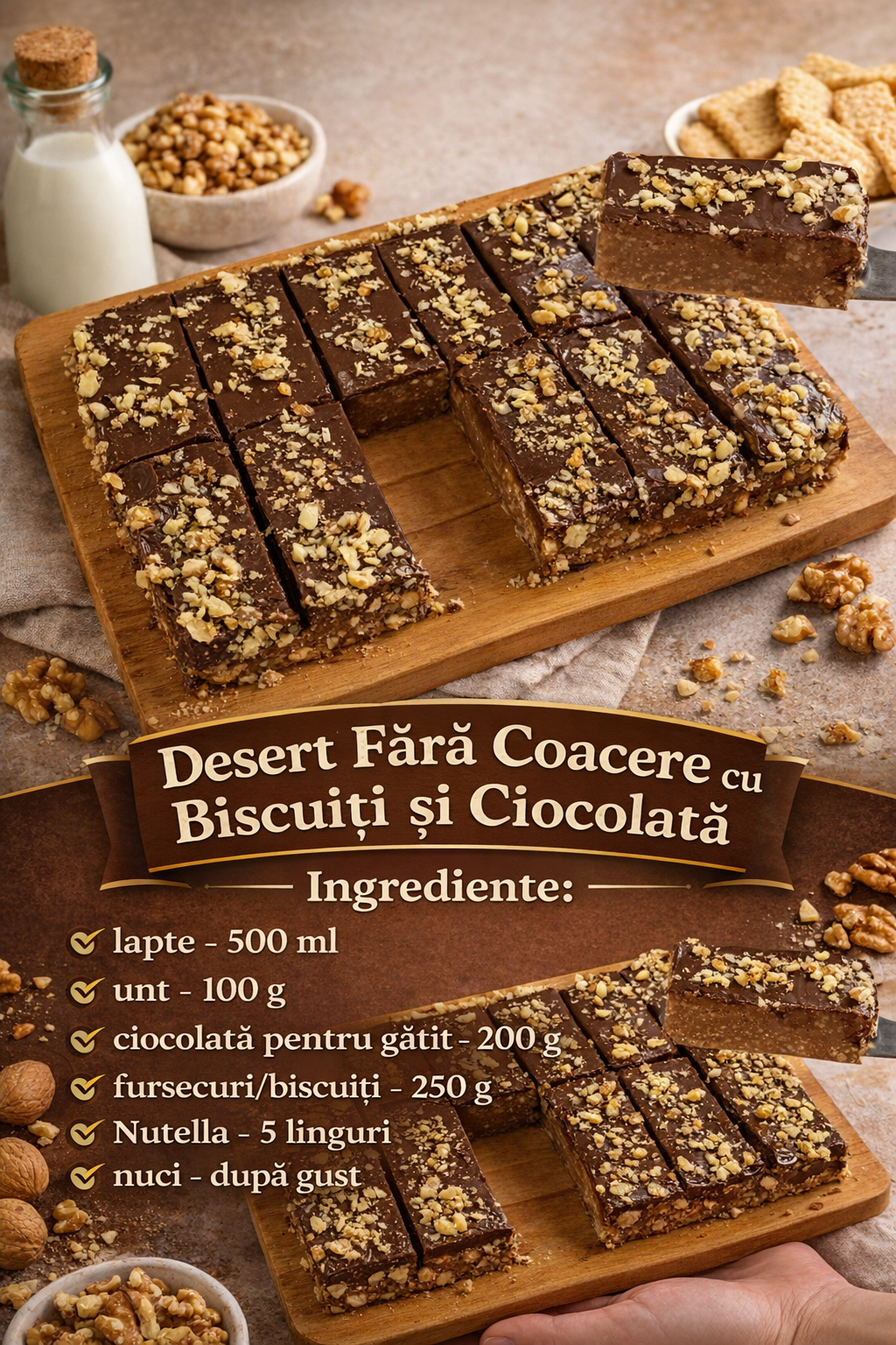 Acum taiati desertul in dreptunghiuri si presarati-le cu nuca tocata.