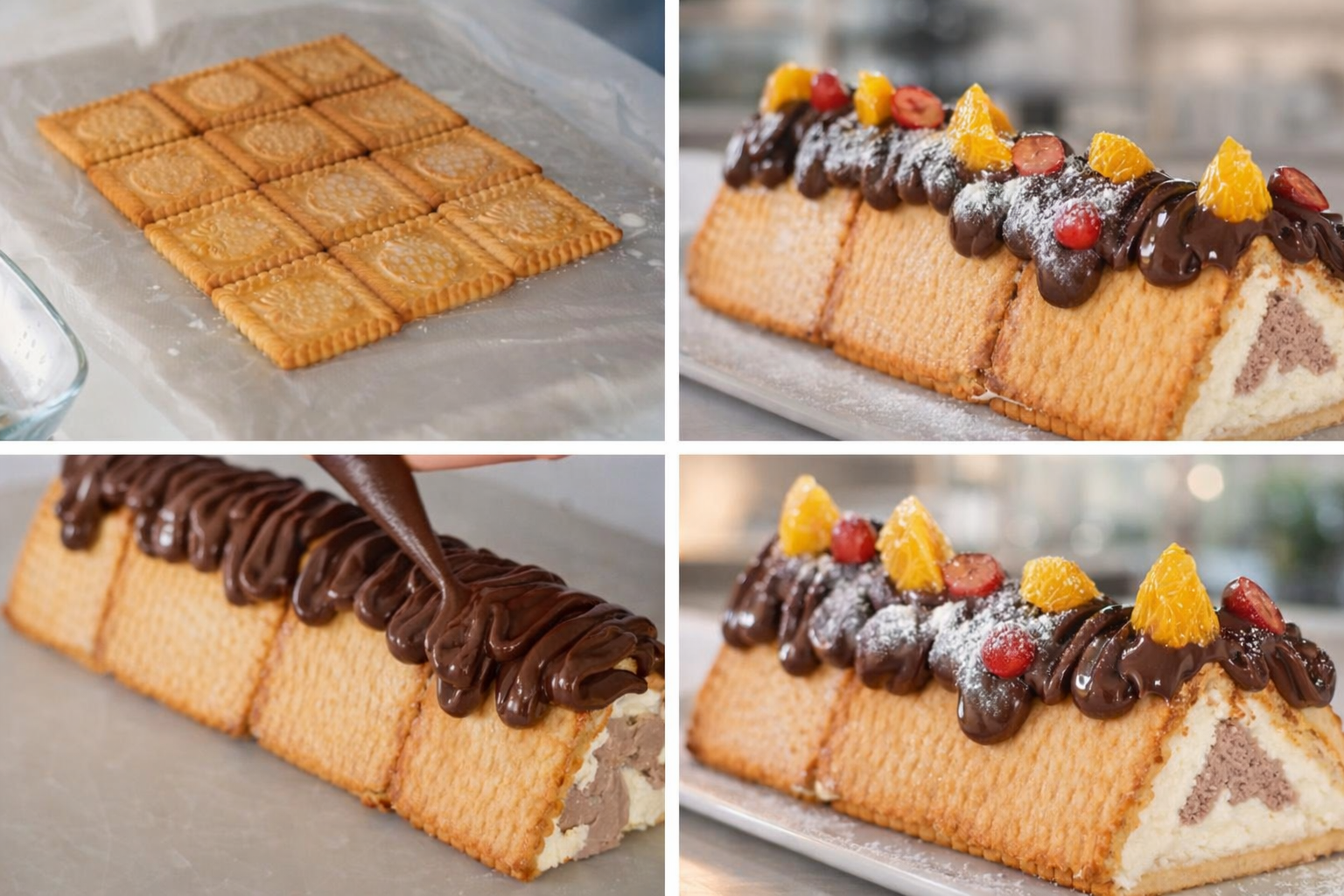 Asezati biscuitii deasupra, fiecare inmuiat in prealabil in lapte, formand un strat cu 3 randuri.