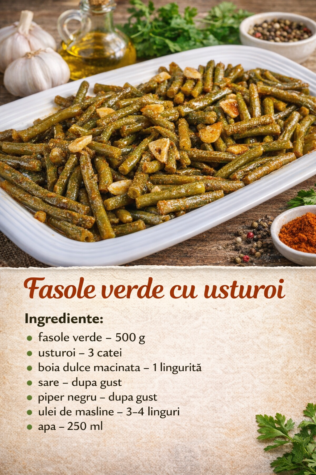 Dupa acest timp se scurge apa, se toarna ulei peste fasole si se adauga usturoiul.