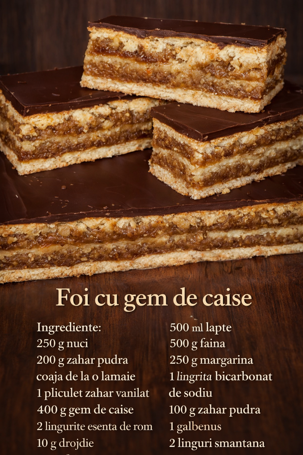 Aluatul framantat este impartit in trei parti. Prima parte este intinsa pe o tava pe care este asezata o foaie de copt de 24 × 38 cm. Se unge cu jumatate din gemul de caise, se presara 1 lingura de esenta de rom, apoi se presara cu jumatate din nucile zaharite.