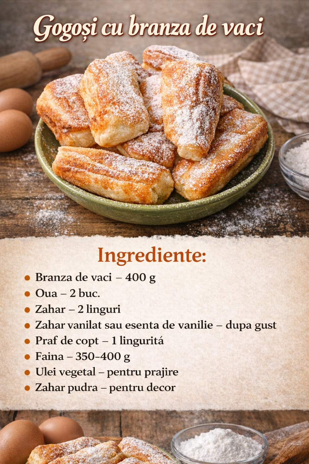 In aceasta versiune, delicioasele gogosi cu branza de vaci nu sunt prea dulci, asa ca le puteti indulci stropindu-le usor cu zahar pudra, daca este necesar.