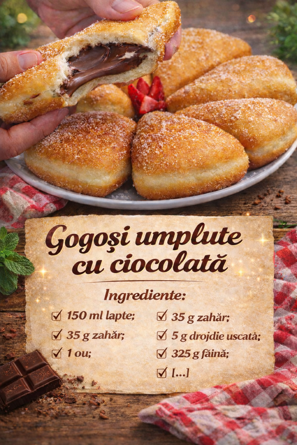 Aceste gogosi delicioase si usor de preparat sunt umplute cu ciocolata sau orice umplutura preferata, fiind ideale pentru a satisface pofta de dulce. Serviti-le calde pentru a va bucura de o textura pufoasa si o umplutura delicioasa!
