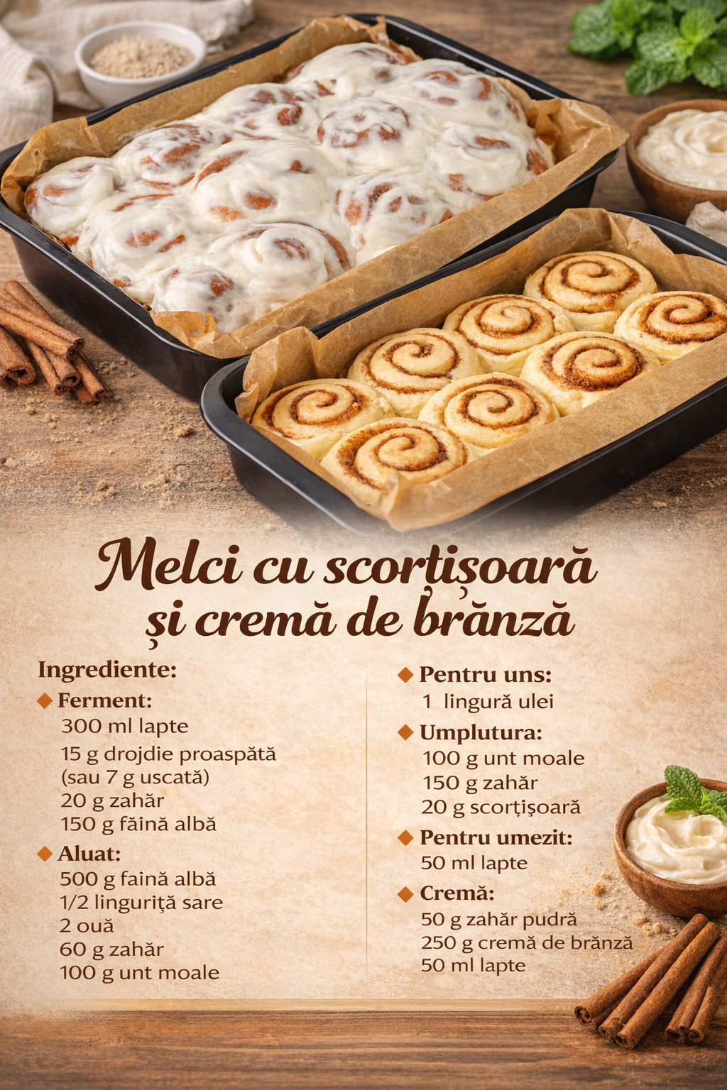 4️⃣ Intinde aluatul intr-o foaie dreptunghiulara (aprox. 0,4 cm). Unge cu unt si presara zahar + scortisoara.