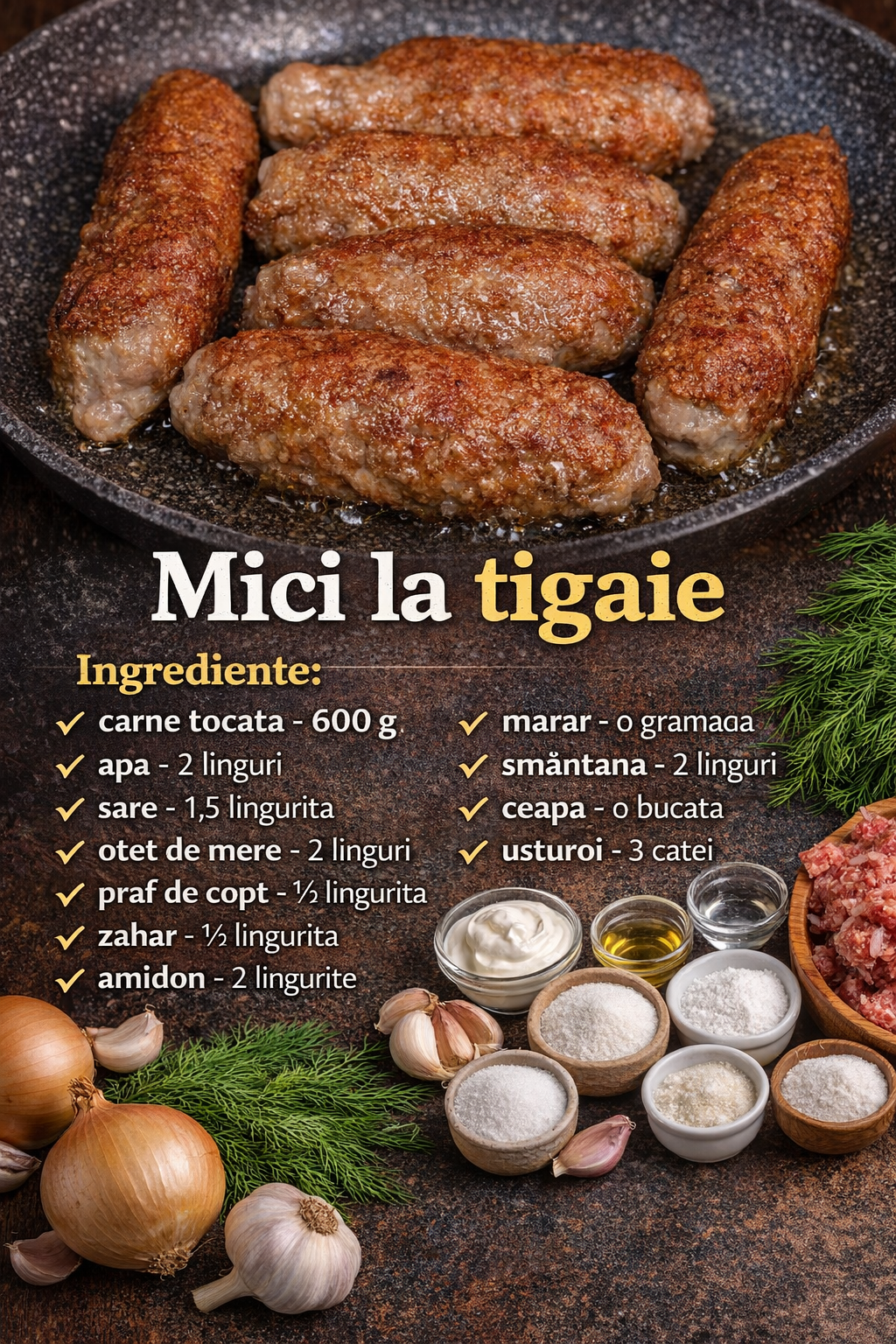 In carnea tocata, adaugati o lingura de sare, praf de copt, amidon, smantana si usturoi tocat.