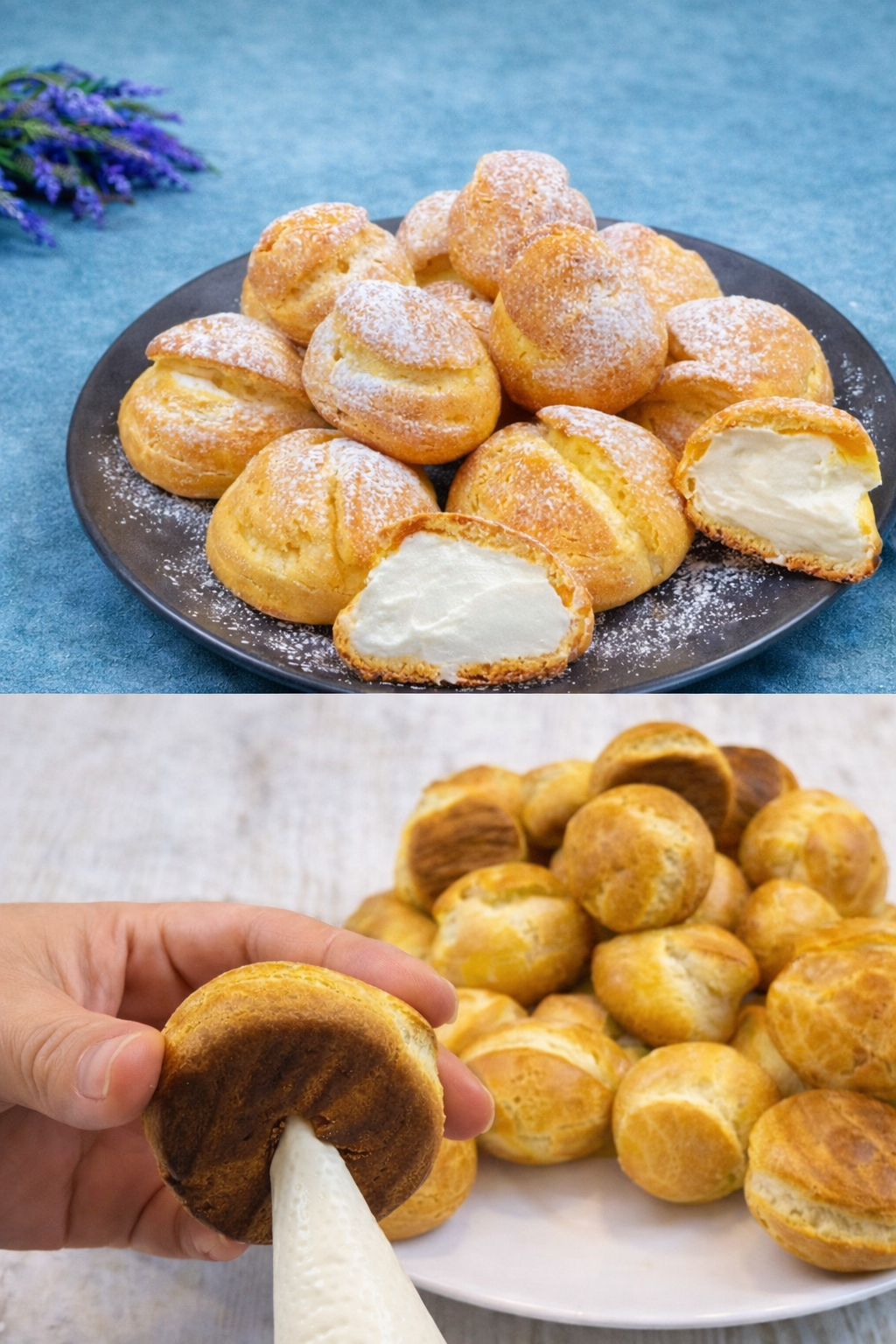 Faceti gauri in gogosi cu un cutit, introduceti in ele varful unei pungi de patiserie si umpleti aluatul copt.
