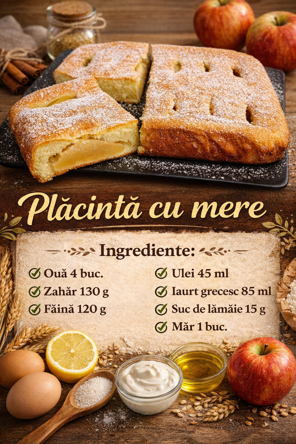 In 30 de minute si cu un mar puteti face un tort atat de delicios pentru ceai, incat o sa va lingeti degetele. Iaurtul adaugat in aluat se coace bine, se dovedeste luxuriant si moale.