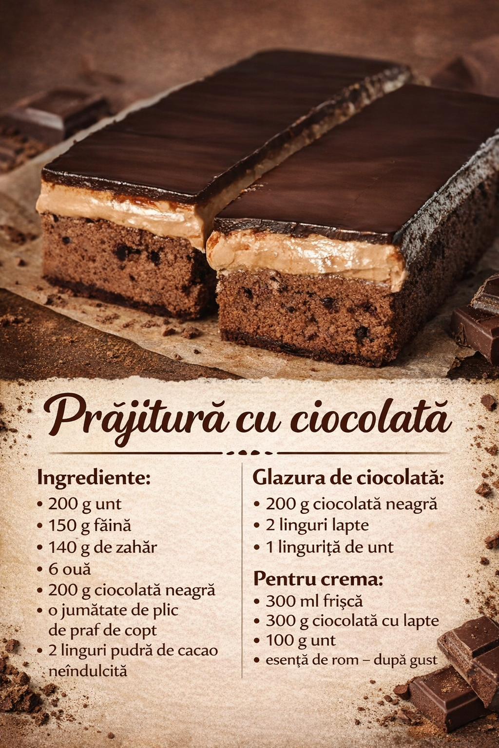 Deasupra se pune glazura obtinuta din amestecul de ciocolata neagra, lapte si unt.