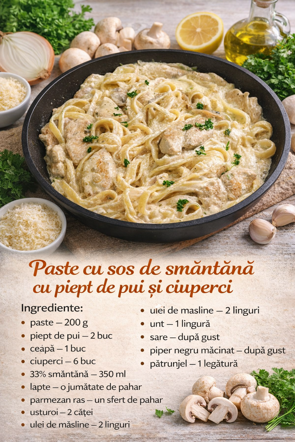 Paste cu sos de smantana cu piept de pui si ciuperci- Aromat cu usturoi si parmezan