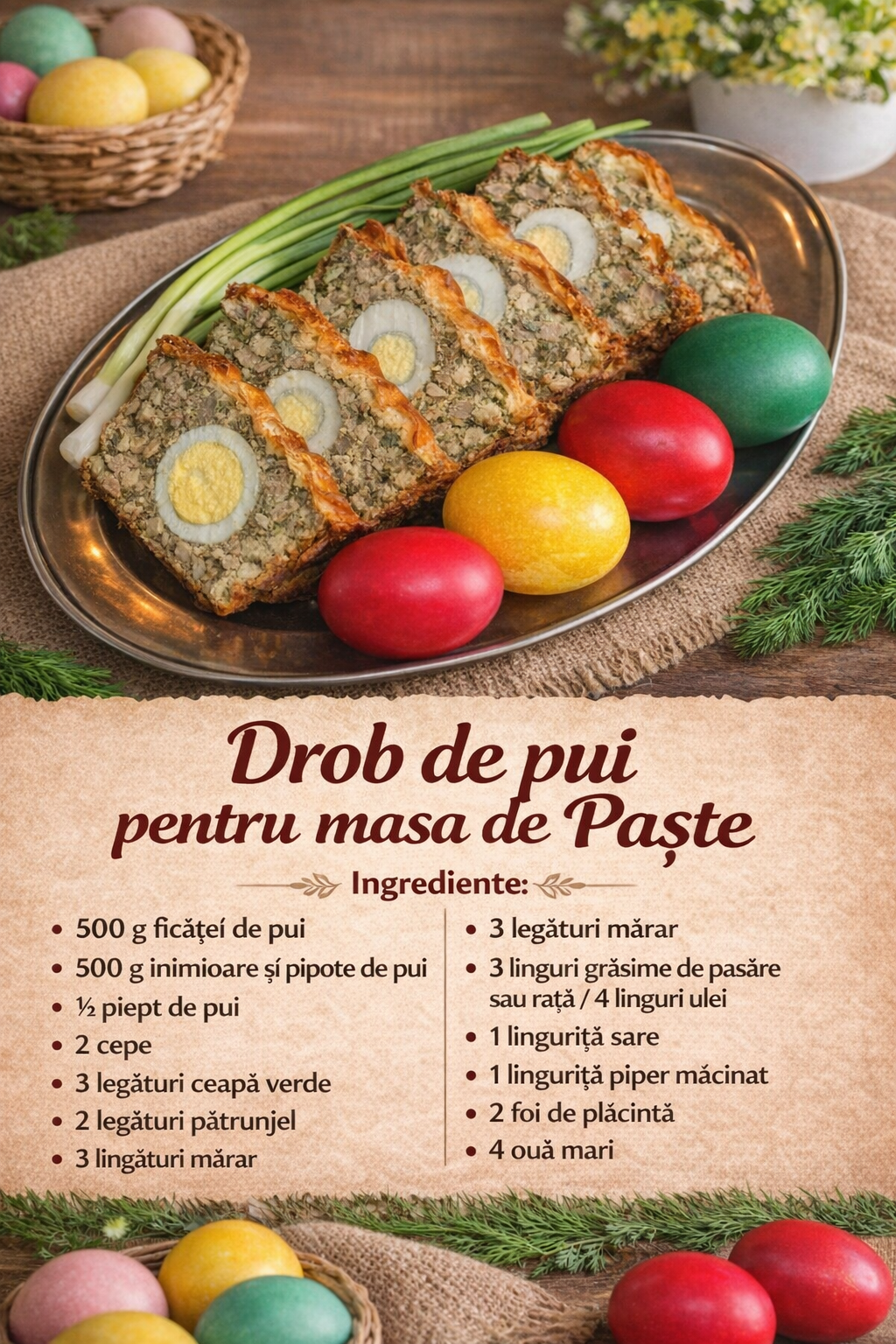 Drob de pui un preparat traditional de Paste din bucataria romaneasca nelipsit de pe mesele noastre cu ocazia Sarbatorilor Pascale, foarte bun si gustos, aromat si foarte usor care se mananca alaturi de o salata verde sau simplu cu mustar, fiind la fel de bun.