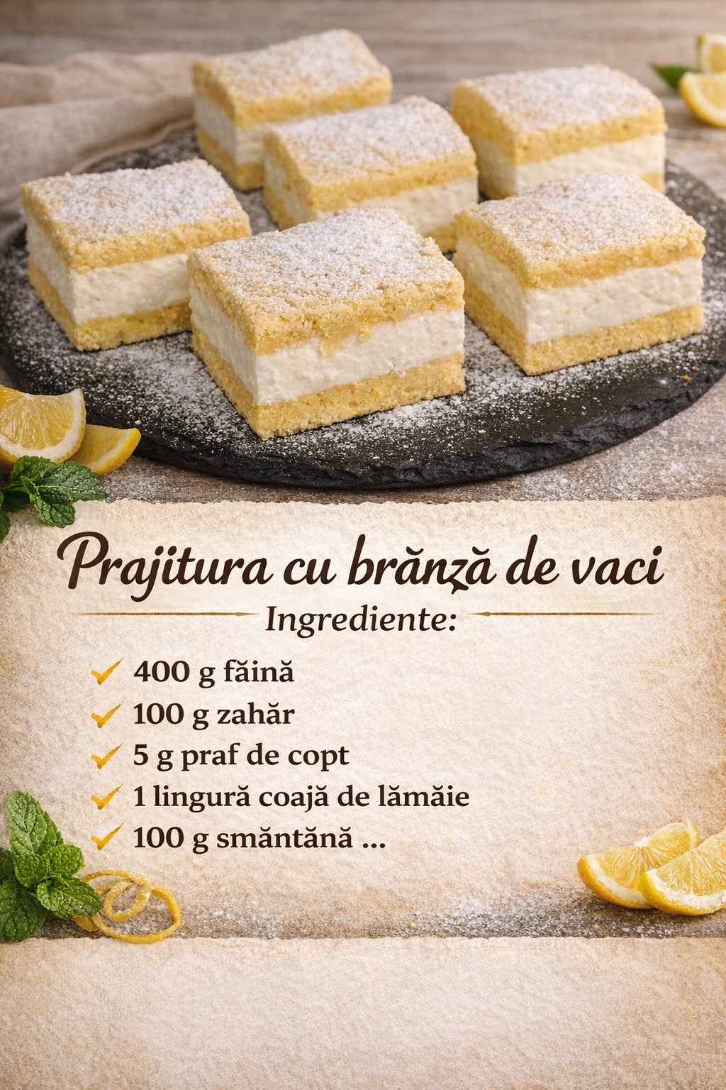 Prajitura fina cu branza de vaci cu un aluat sfaramicios si o crema delicioasa