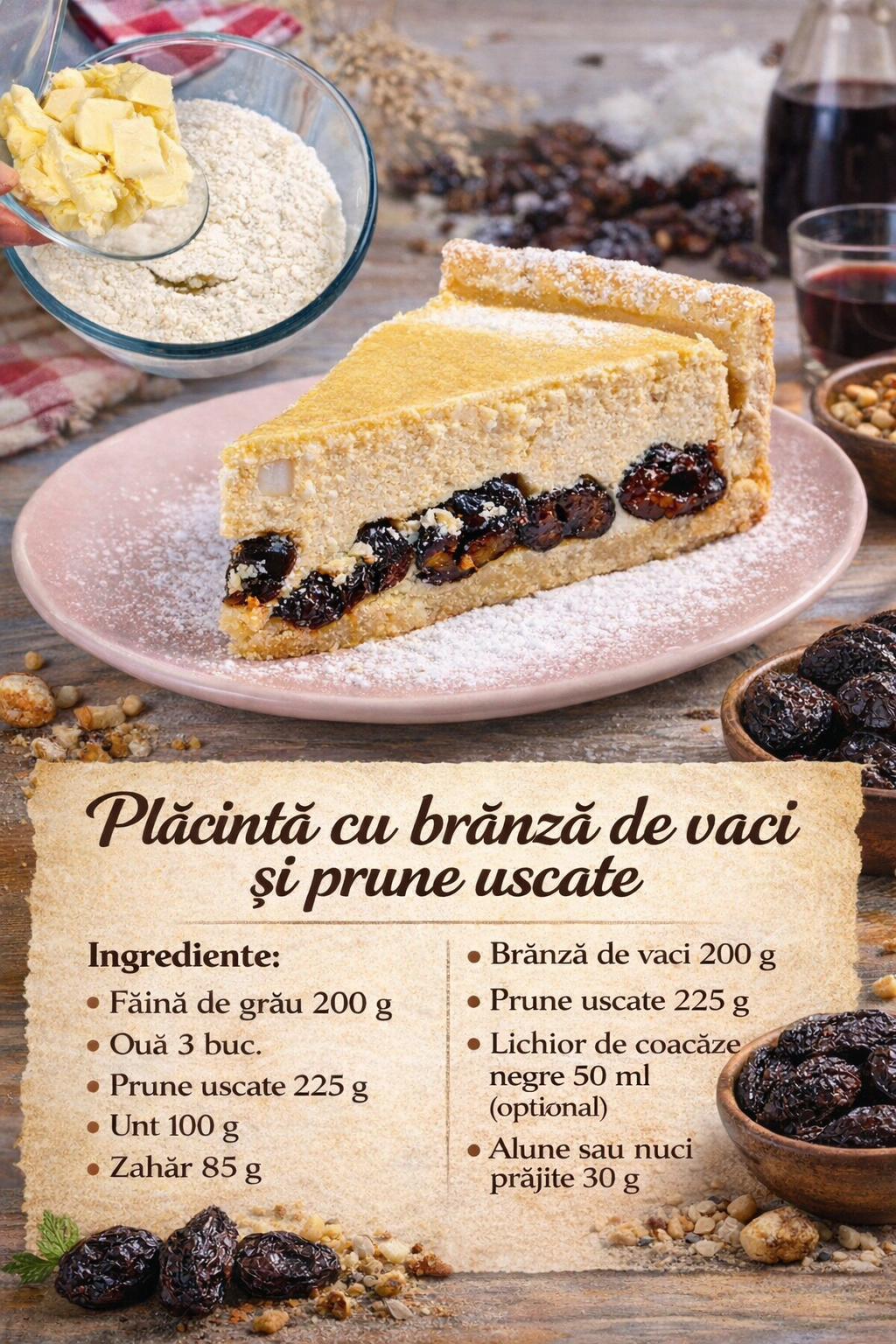 Puneti prune uscate sau alte fructe uscate pe baza de aluat si umpleti cu umplutura de branza de vaci.