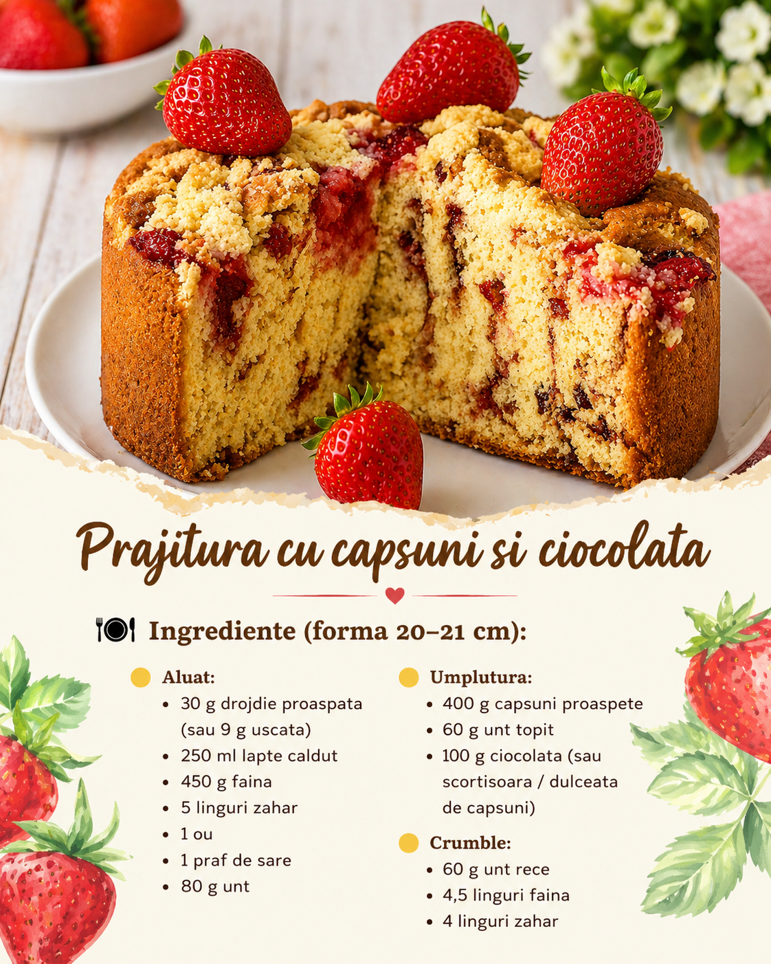 🍓 Placinta pufoasa cu capsuni si ciocolata – desert de casa absolut delicios