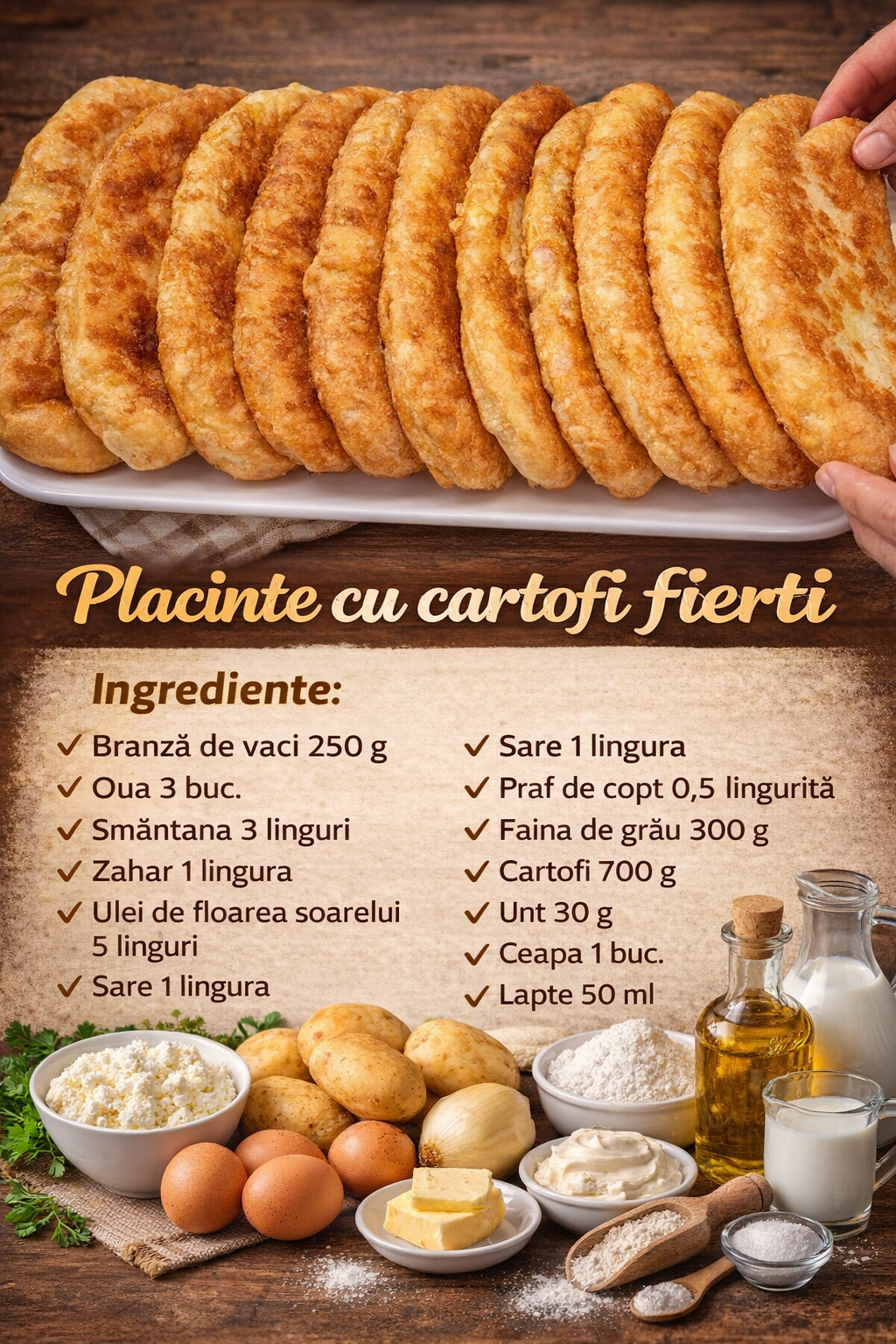 Umplutura acestui fel de mancare poate fi absolut orice. De aceea, cartofii pot fi inlocuiti cu varza, ou si ceapa verde sau un amestec de branzeturi.