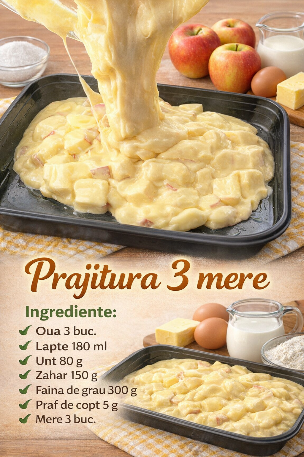 Combinati aluatul cu merele taiate cubulete si puneti-l intr-o tava unsa cu unt.