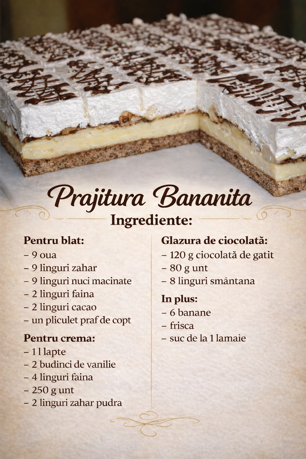 Aluatul de nuci se asociaza divin cu gustul uimitor al bananelor si al ciocolatei. Nu amana, incepe sa te pregatesti si lasa-te purtat de acea perfectiune. Doar o ceasca de cafea parfumata lipseste.