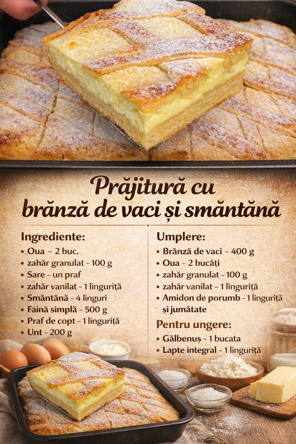 Bateti galbenusul de ou cu lapte si ungeti blatul prajiturii.