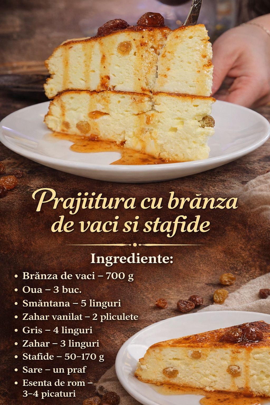 Scoateti stafidele din apa calda si uscati-le pe un servetel, adaugati-le la amestecul cu branza de vaci.