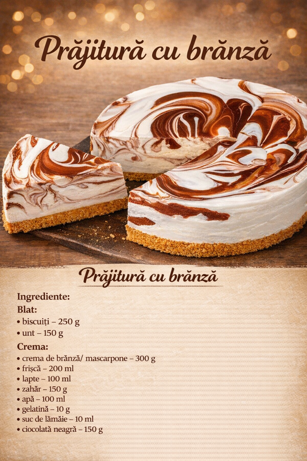 Puneti in cateva linguri de crema cu ciocolata pe suprafata prajiturii.