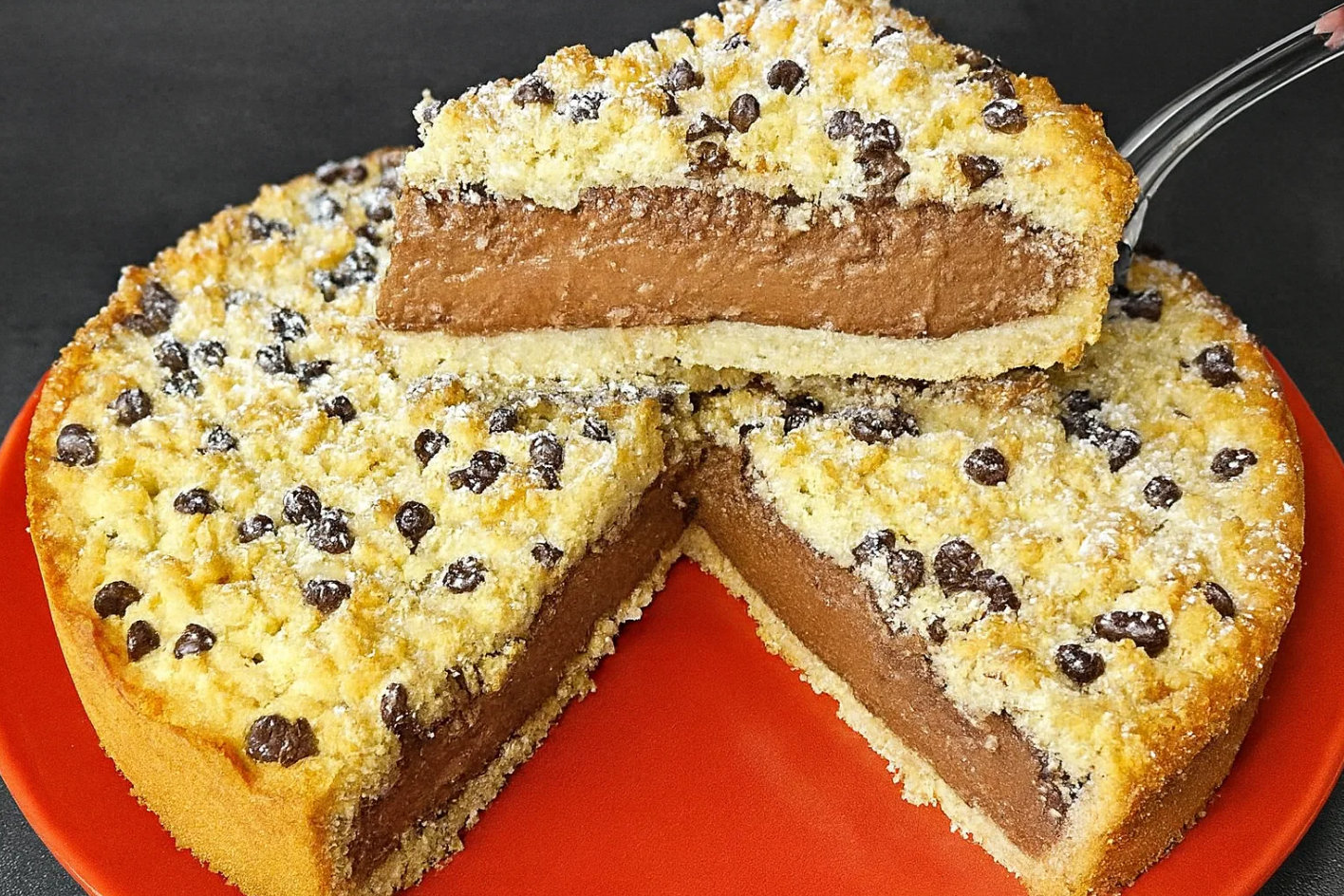 <p>Presarati desertul cu bucati de ciocolata si coaceti-l in cuptorul preincalzit la 200 °C timp de 20 de minute.</p>