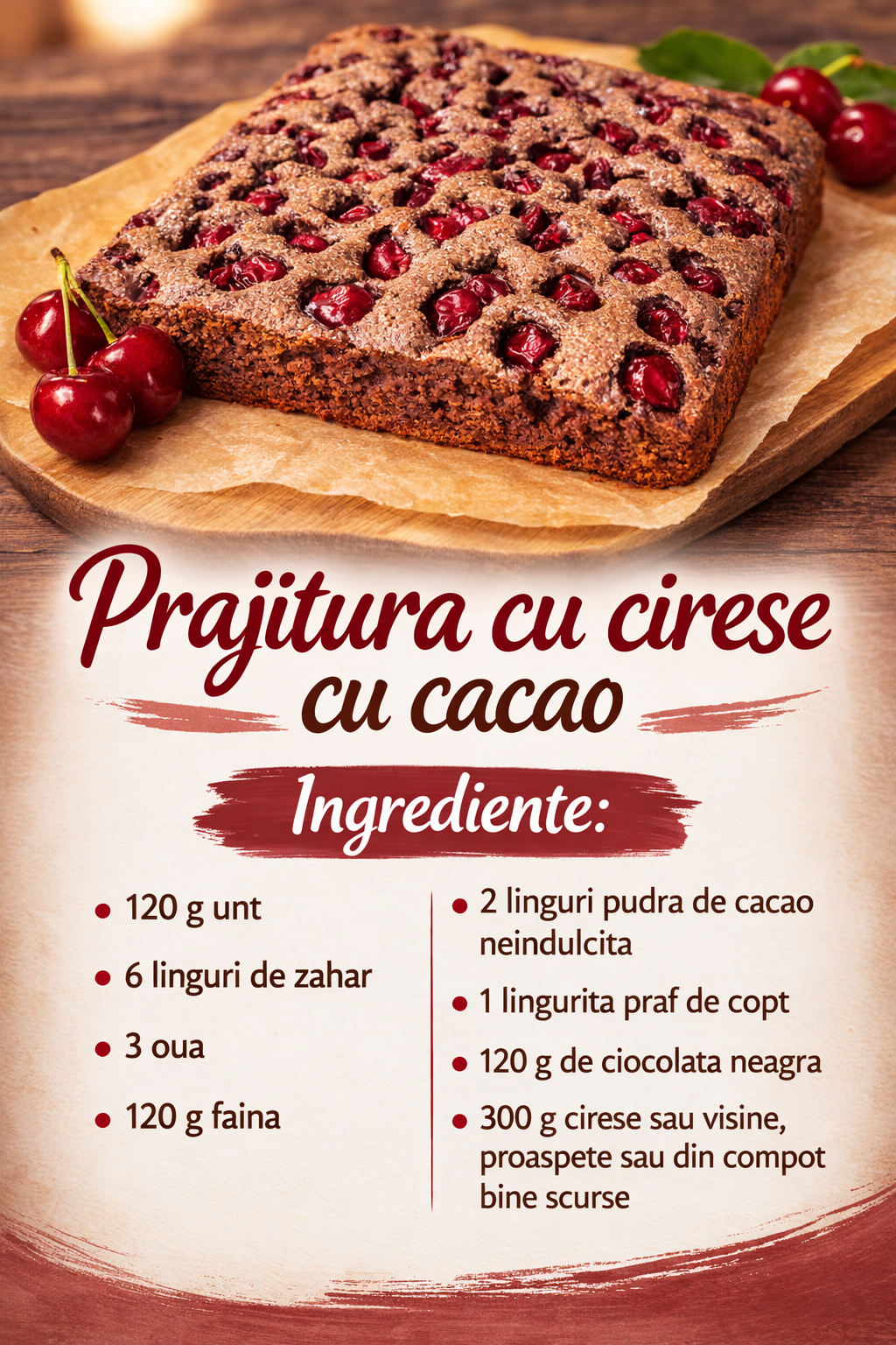 Presarati ciresele scurse deasupra si coaceti la cuptor la 180 de grade pentru aproximativ 30 de minute.