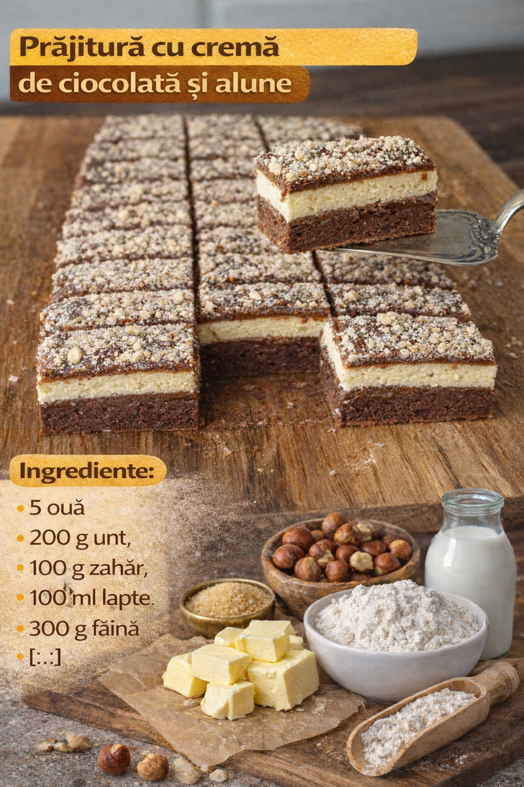 Se presara cu alune tocate si se lasa prajitura sa se raceasca la frigider.