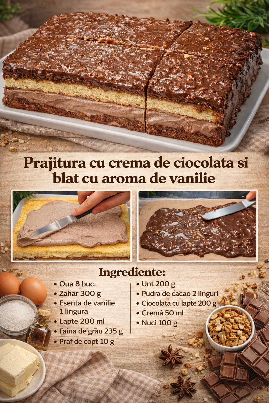 Intindeti blaturile cu o crema omogena de ciocolata, ungeti prajitura cu ea deasupra si pe margini.