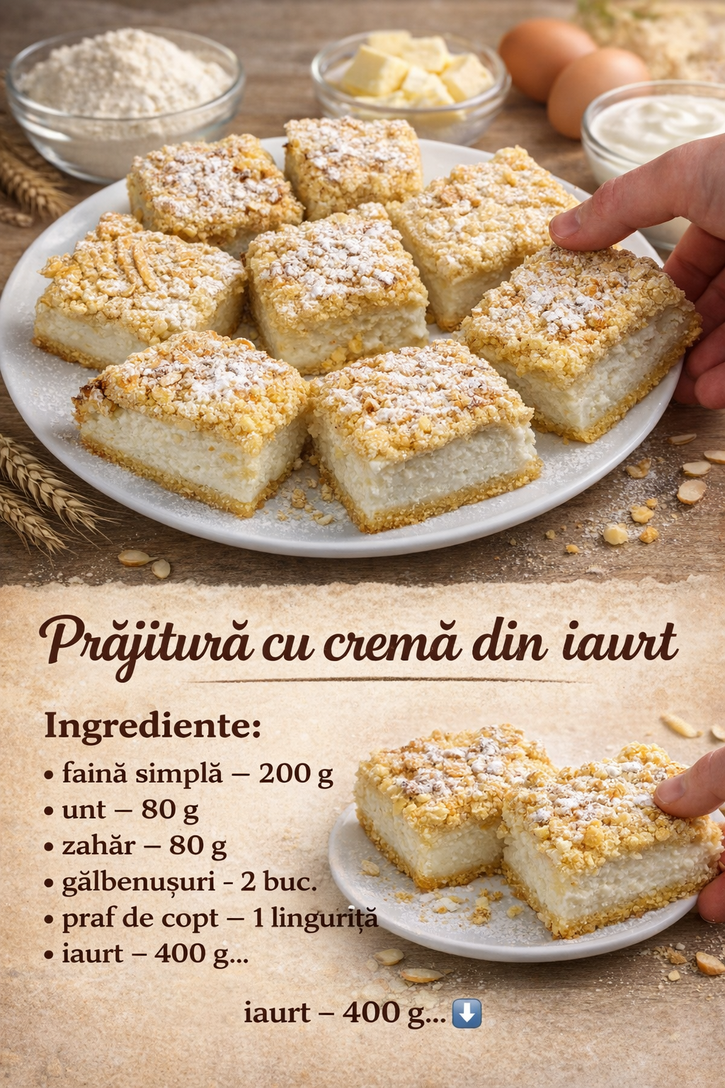 Turnati 400 g de iaurt intr-un castron adanc si adaugati 80 de gde zahar.