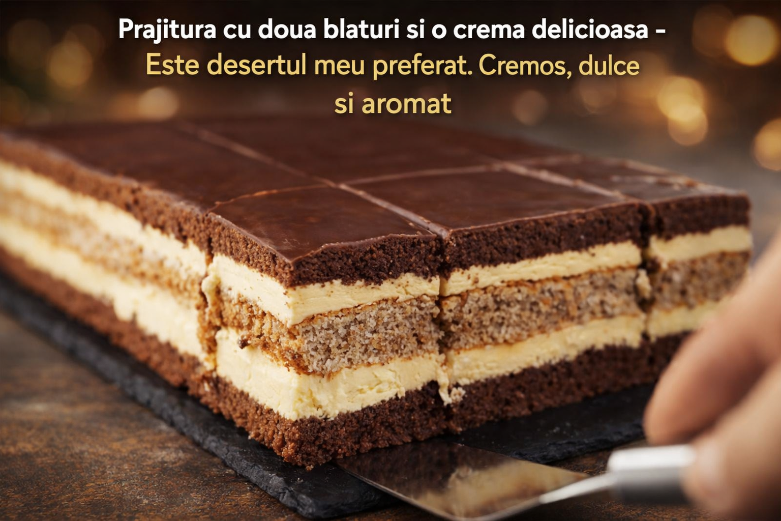 Punem aluatul cu nuci racit peste crema din tava, punem cealalta jumatate de crema si apoi jumatatea de aluat cu cacao.