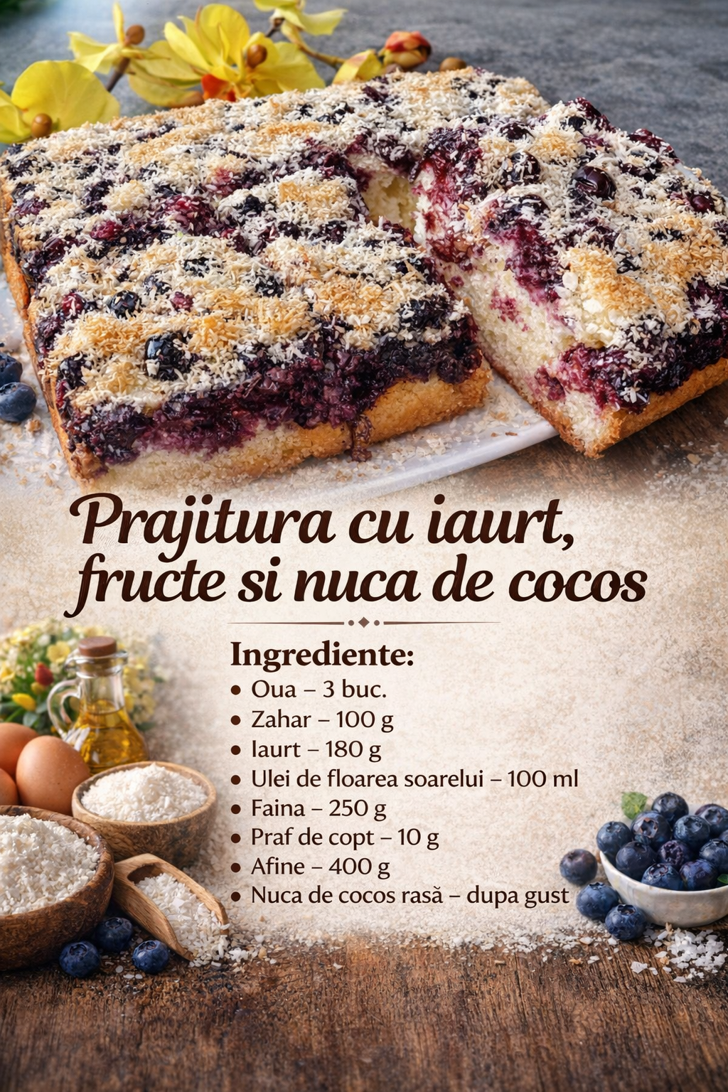 Se presara prajitura cu iaurt cu fructe cu nuca de cocos si se coace in cuptorul preincalzit la 180 °C pentru 45 de minute.