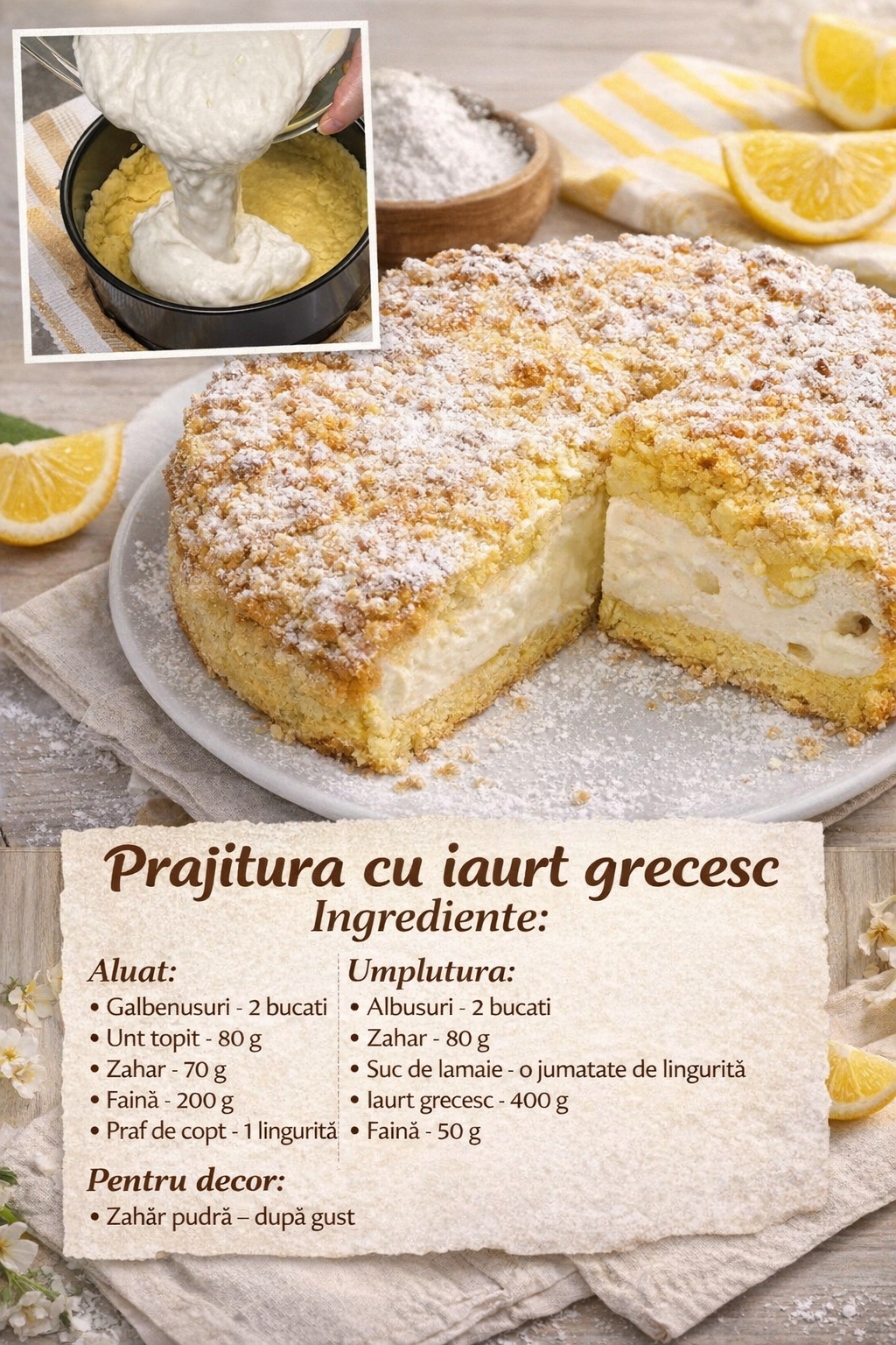 Dupa ce s-a copt, stropiti tortul cu zahar pudra si lasati-l sa se raceasca la frigider pentru cateva ore.