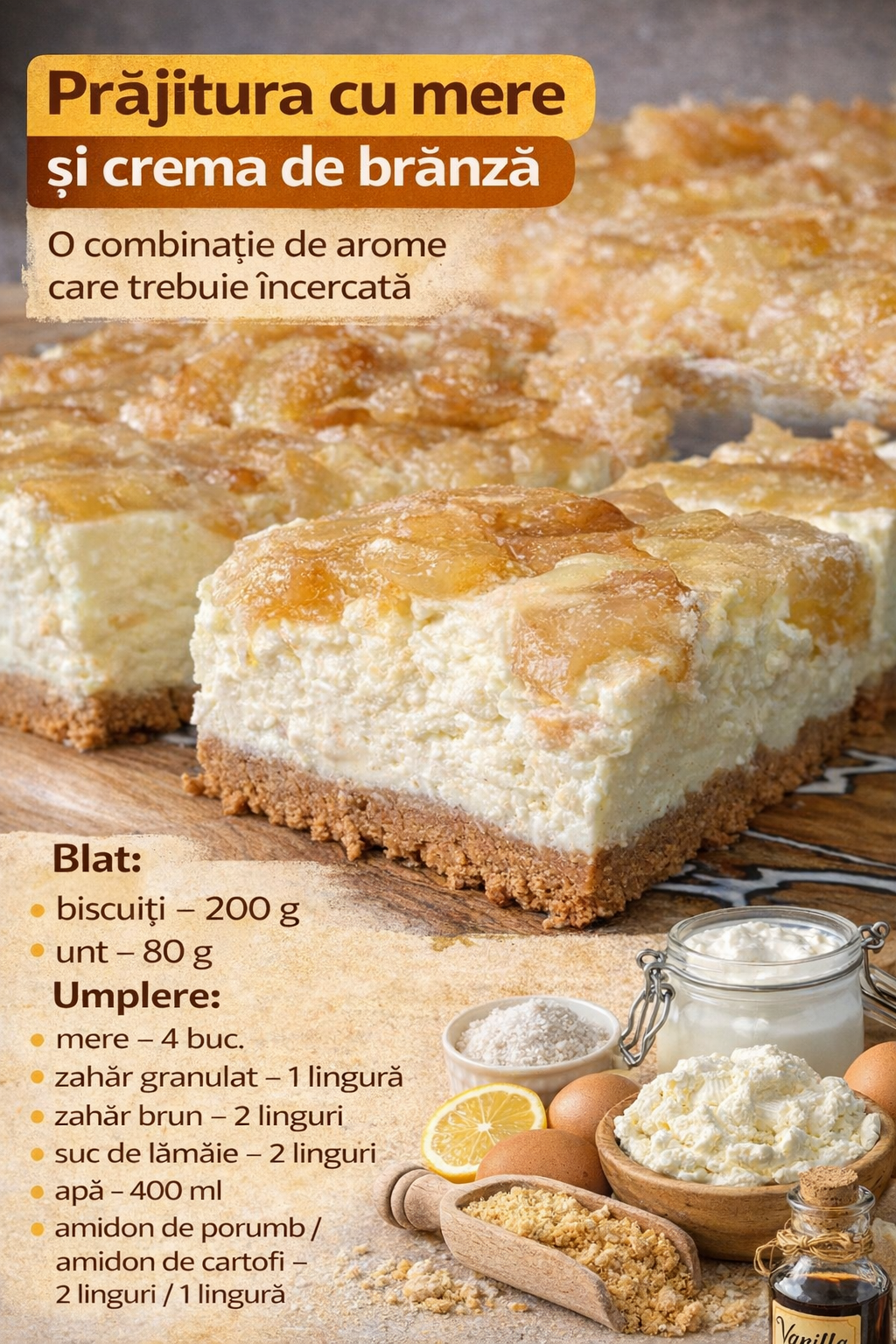 Se toarna crema in forma pe blatul copt si se acopera cu umplutura de mere.