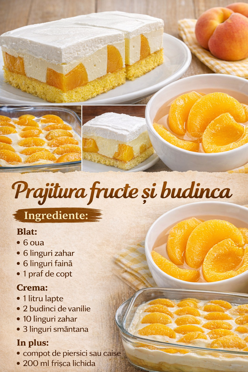 Pentru decor: frisca, nuca de cocos si piersici din compot.