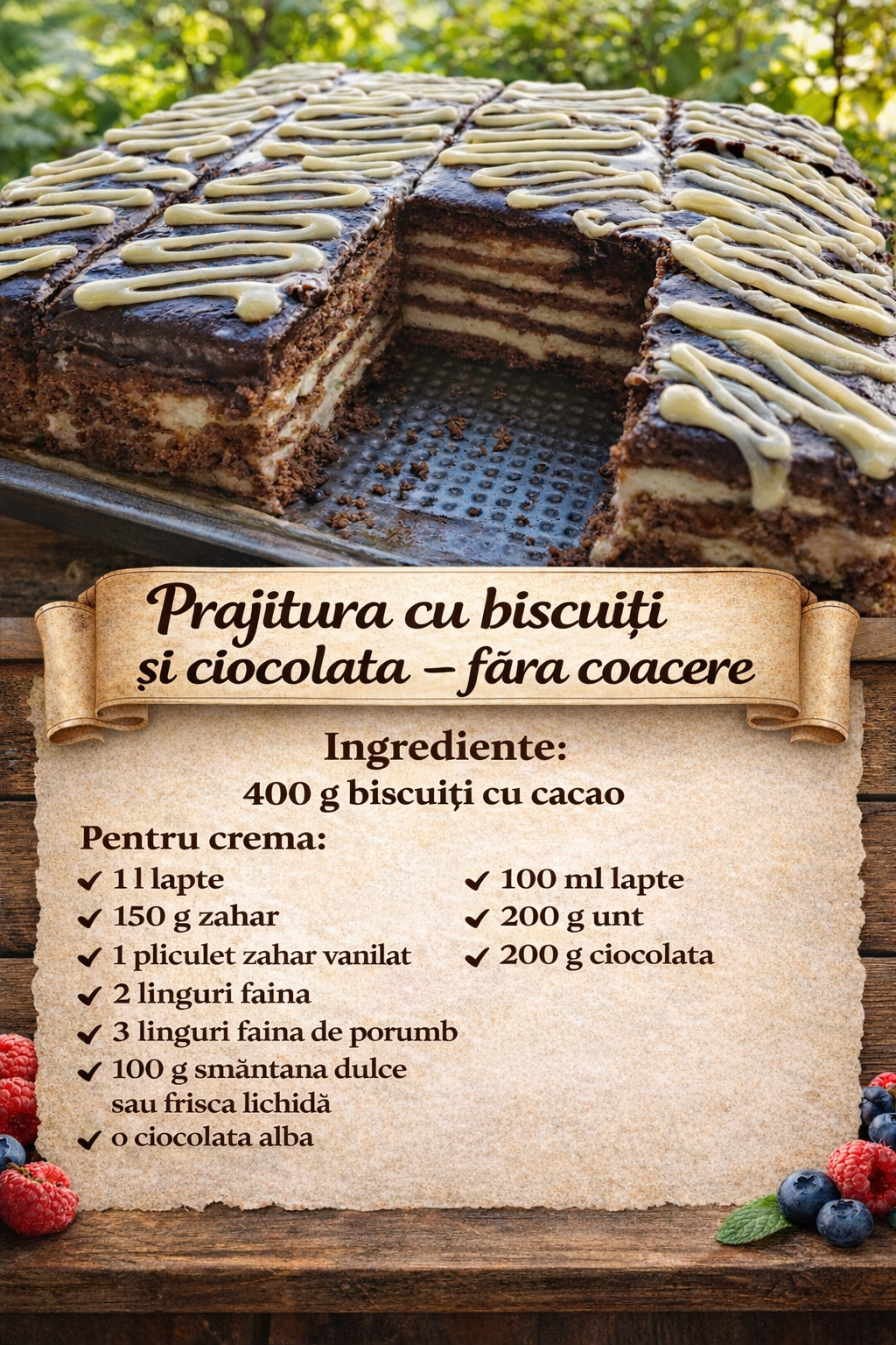 Repetati procesul de inca 3 ori creand straturi de biscuiti si crema si terminati cu un strat de biscuiti.