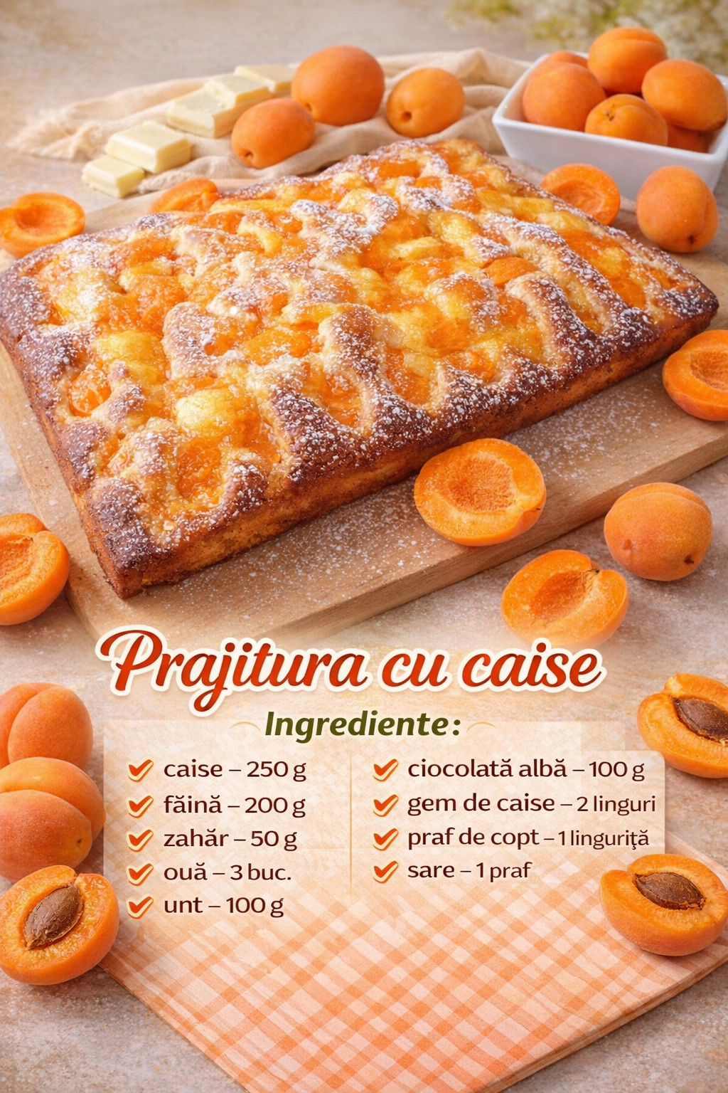 Spalati si uscati bine caisele si taiati-le in jumatati pana la sferturi dupa indepartarea samburilor.