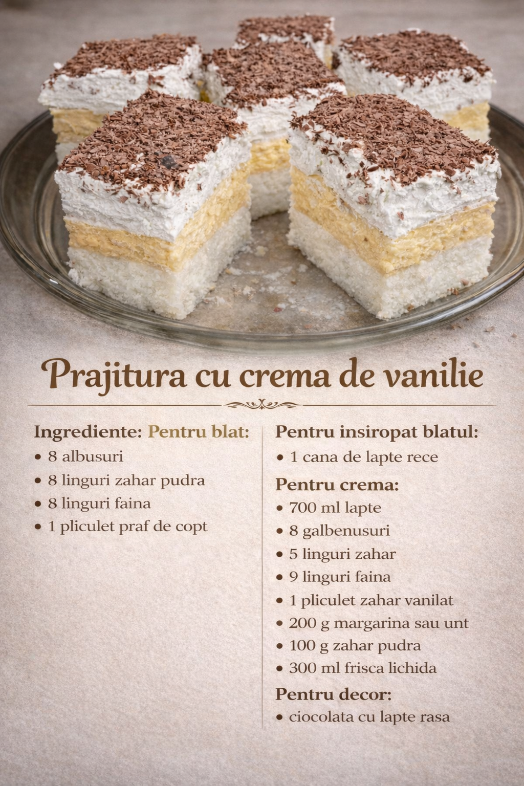 Preincalziti cuptorul la 180 C si lasati blatul timp de 15 minute, pana se rumeneste. Se toarna laptele rece peste blatul fierbinte si se lasa sa se raceasca.