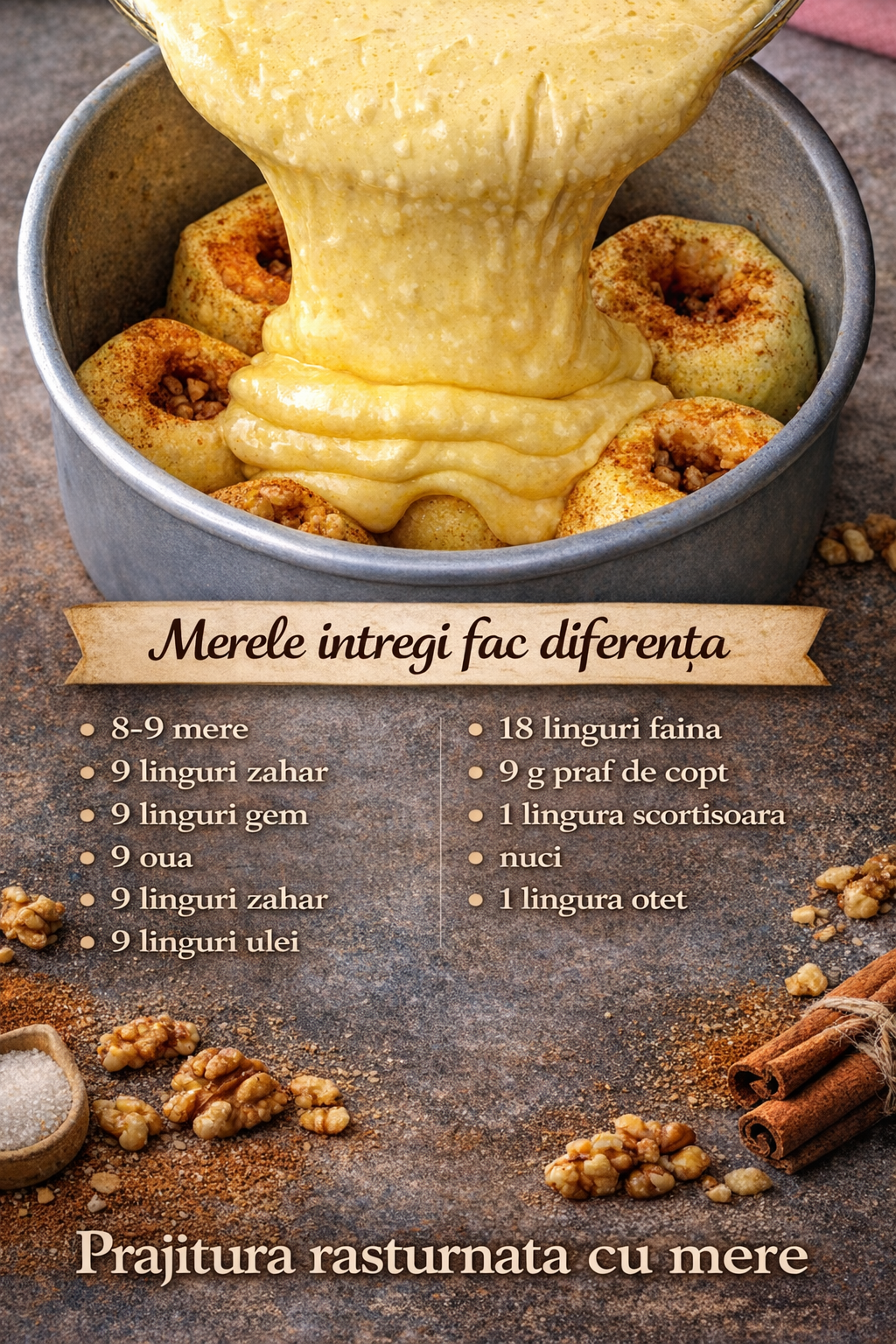 Vedeti o alta reteta usoara si delicioasa pentru placinta rasturnata, dar de data aceasta cu mere intregi! Rezultatul este un tort destul de inalt, ceea ce il face diferit de alte placinte cu mere!