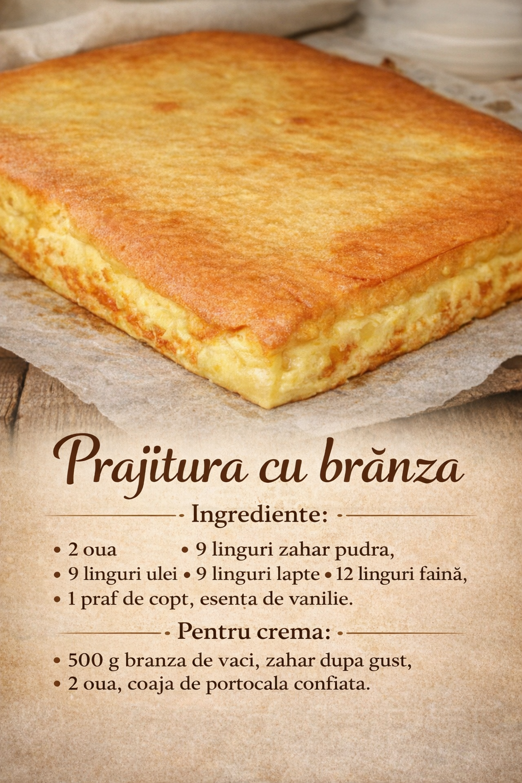 Vei folosi pentru acest desert: 2 oua, 9 linguri de zahar pudra, 9 linguri de ulei, 9 linguri de lapte, 12 linguri de faina, 1 praf de copt, esenta de vanilie.