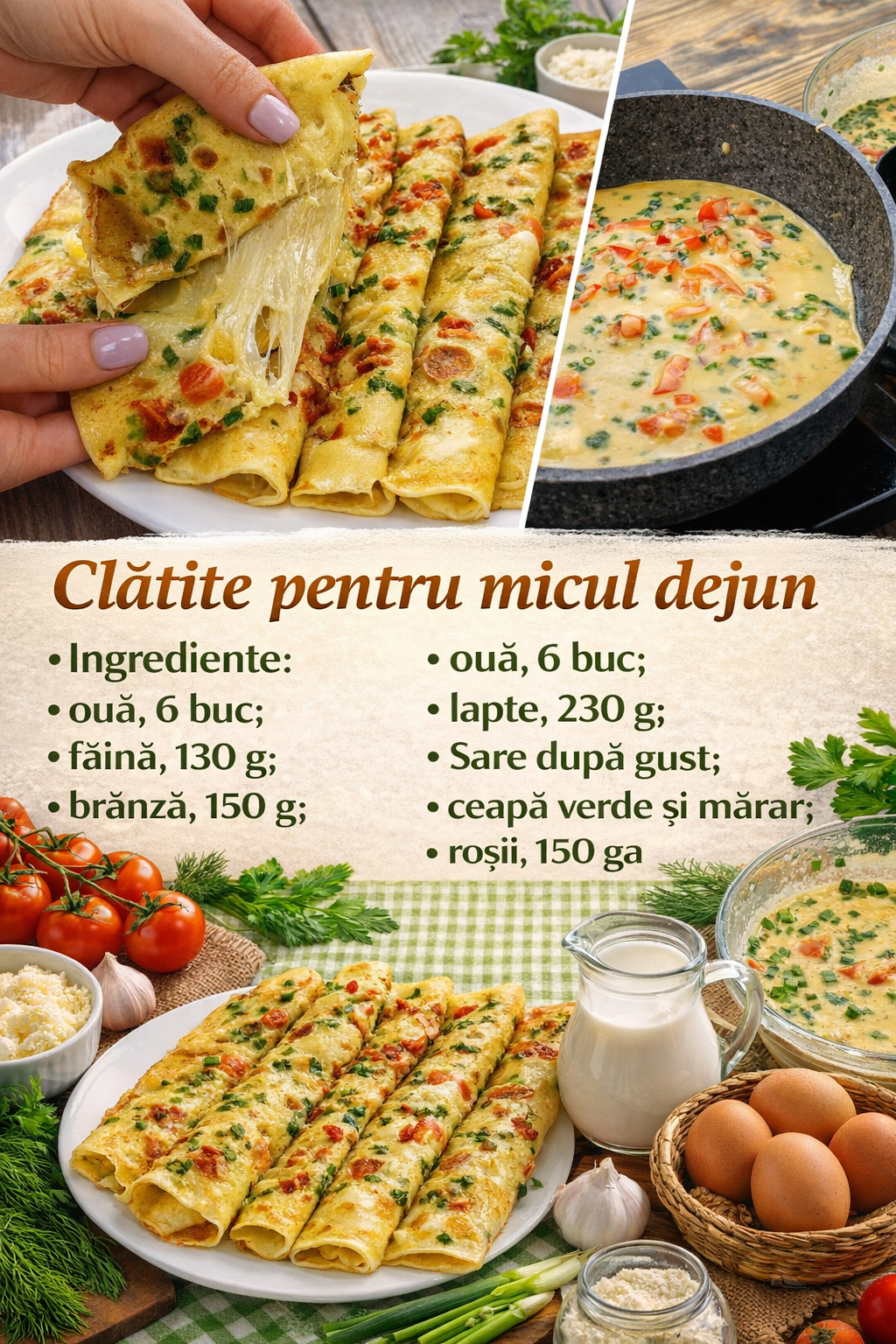 Clatite cu ou umplute cu branza, rosii si verdeata, dar va puteti face propria versiune din orice produs. Daca adaugati si sosuri sarate la astfel de clatite, usturoi, atunci clatitele sunt grozave pentru cina.