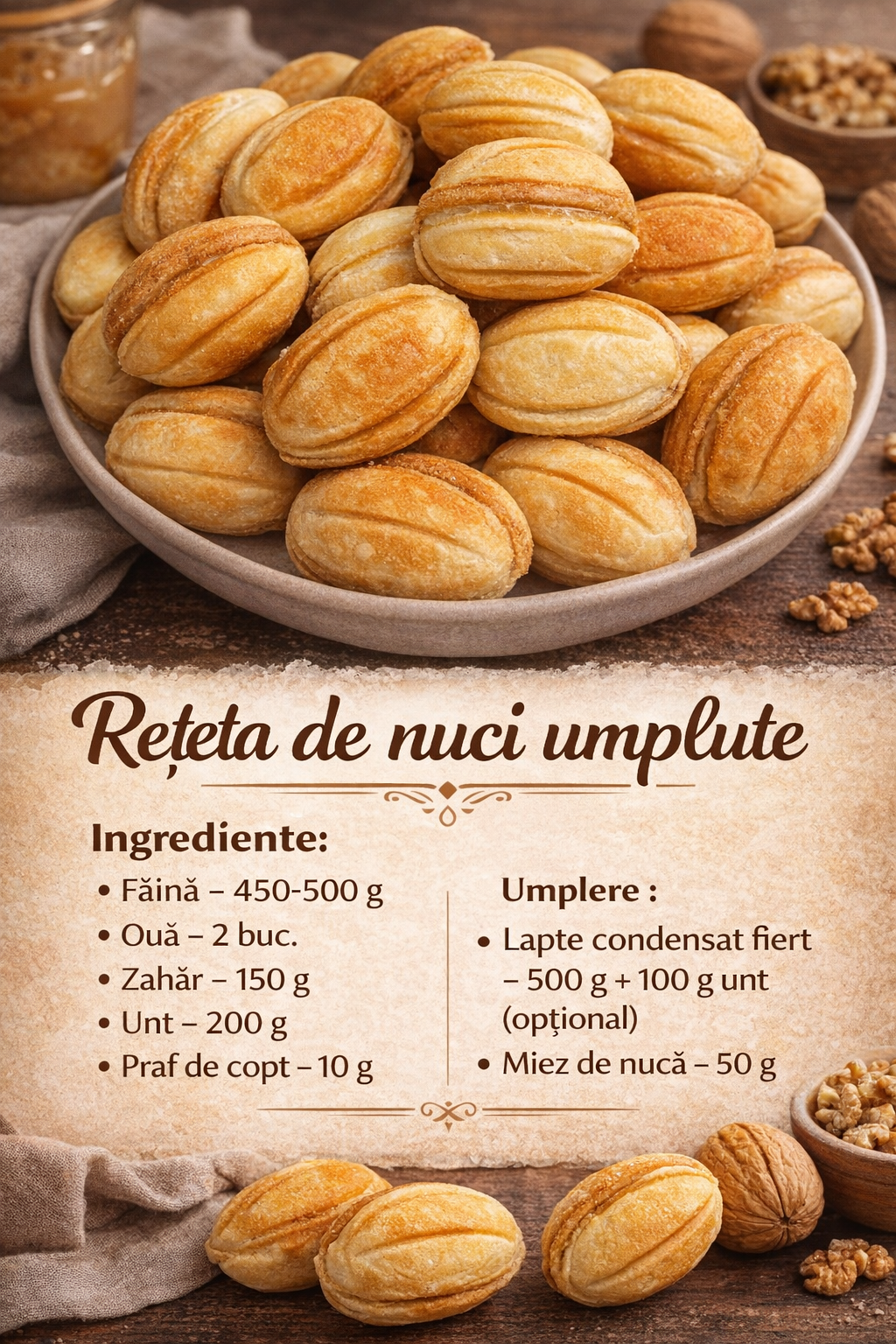 Umpleti fiecare jumatate cu lapte condensat fiert si, daca doriti, adaugati o bucata de nuca.