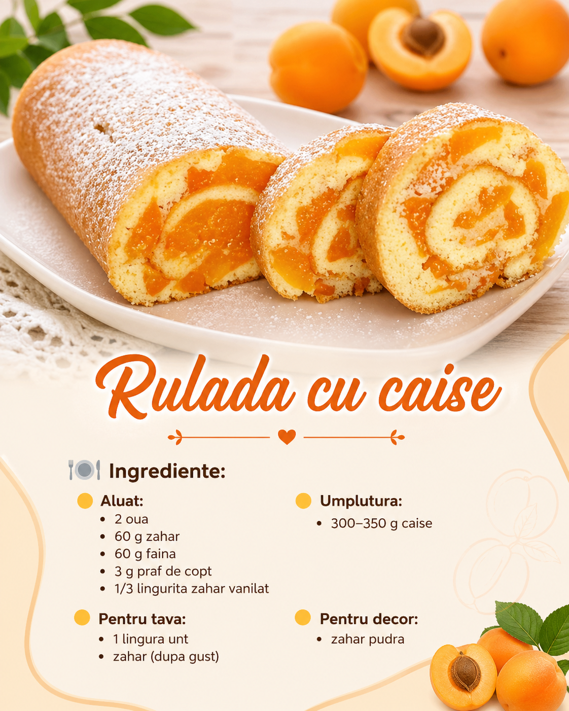 πŸ‘ Rulada rapida cu caise – pufoasa, simpla si gata in cateva minute